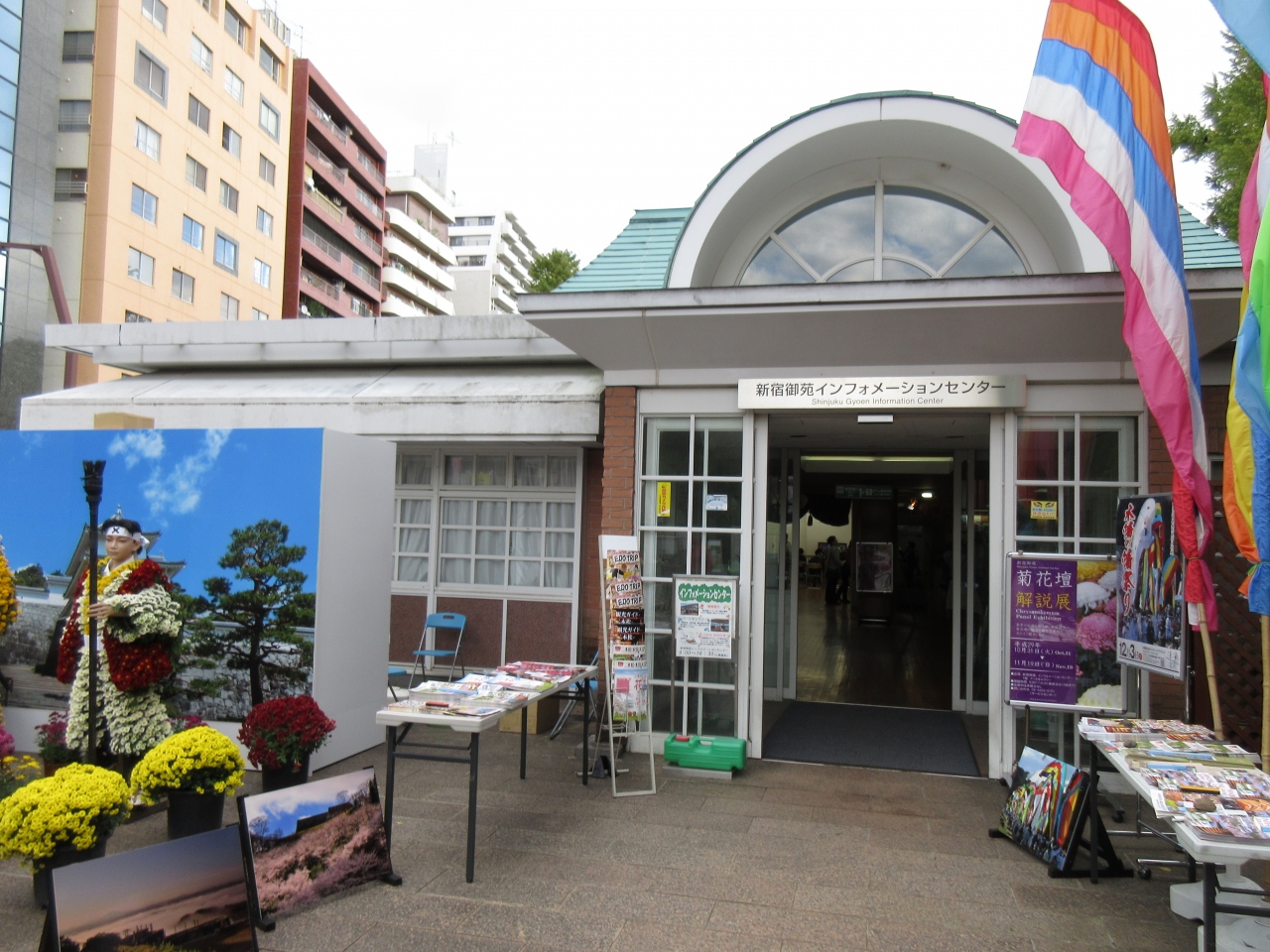 新宿御苑・新宿門入口に建っています。中には御苑で見られる草花や鳥、ドングリなどのサンプルや写真、絵などが展示されているほか、展示室や食堂、休憩所なども設置されています。訪れた日は菊花壇展が行われていることもあり、美しく咲き誇った菊が展示されていました。散策に疲れた身体を休めたり、係の方に御苑について尋ねたりすることもできます。