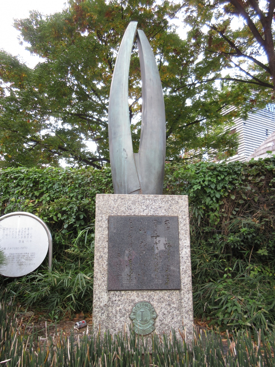 新宿駅東口の工事中の緑地帯にある碑です。新宿ライオンズクラブが建立しました。待ち合わせ場所として使われている広場ですが、木と同化している碑を見る人はいません。詩人として、作詞家として活躍し、昭和の有名な歌謡曲を生み出しました。碑に彫られている字は読みにくいので隣のプレートを読んで昭和の新宿繁華街を思いました。ハサミのようなモニュメントの意味は分かりませんでした。変わっているので足を止めて見てはいかがでしょうか。