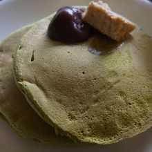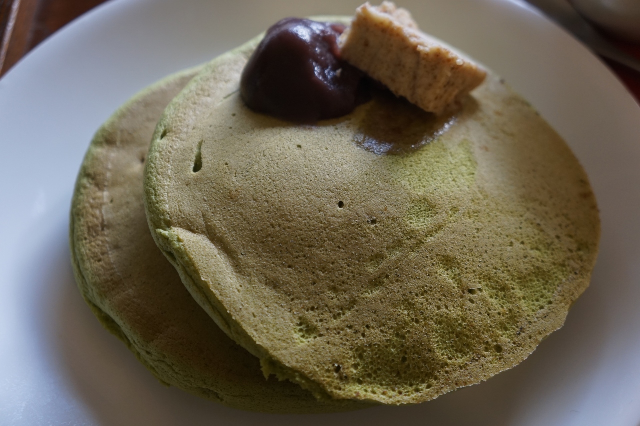 うめぞの カフェアンドギャラリーの名物は、抹茶パンケーキ。ただ、このふわふわだけどネッチョリした食感は何でしょうねえ。そうそう、阿闍梨餅のもっちりした食感に似ていなくもないような。その点は新鮮なんですが、それ以上のものがあるかというとそうでもないような。私としては微妙な評価とならざるを得ないかなと思います。