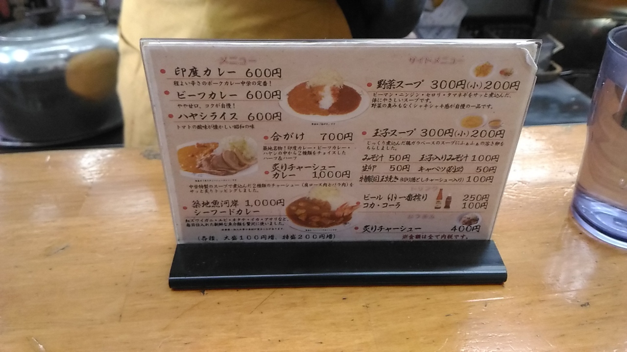築地市場内にある印度カレーの中栄さんです。いつも目の前は通るのですが久しぶりの来店です。基本は印度カレーと少し甘めのビーフカレー、ハヤシライスの3つで共に600円、今日は合いかけが人気でした。キャベツの千切りをご飯とルーに混ぜて頂きます。オススメです、是非。