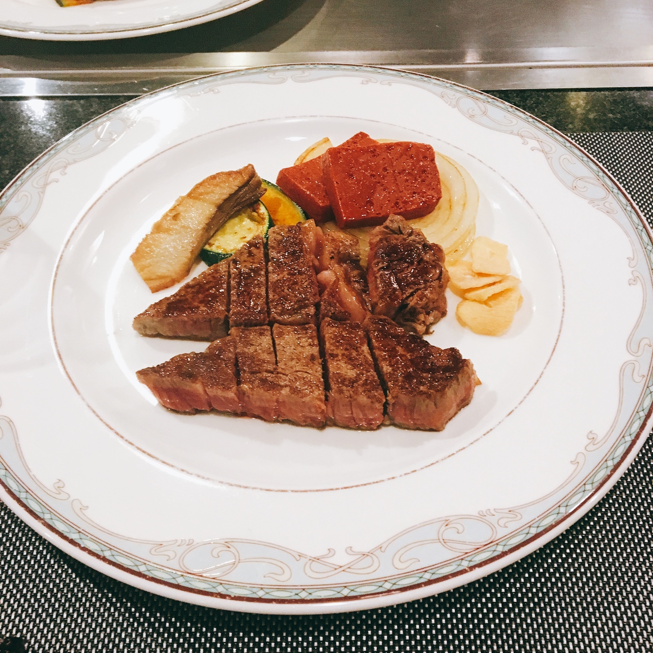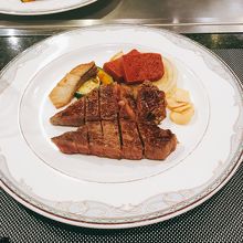 極上のヒレコースをオーダー、焼き方はシェフお薦めでお願いしました。前菜にサラダ、かぼちゃスープ、そのあとはお待ちかねのメイン。