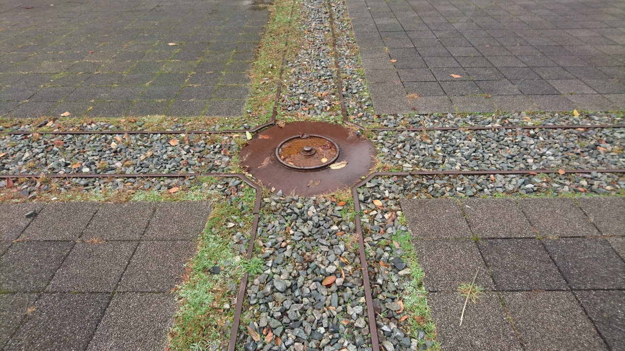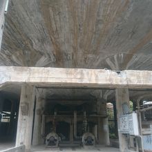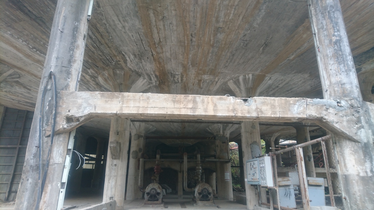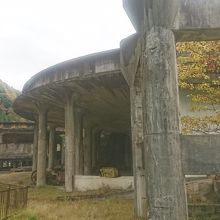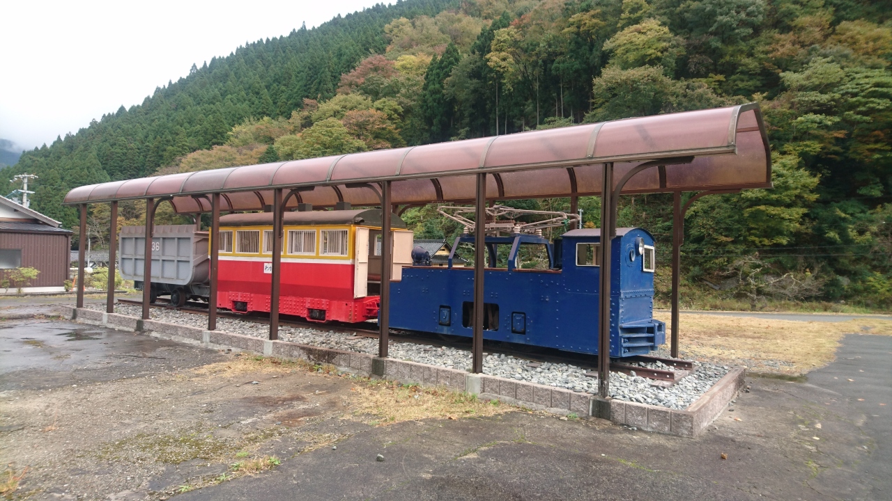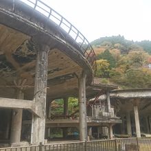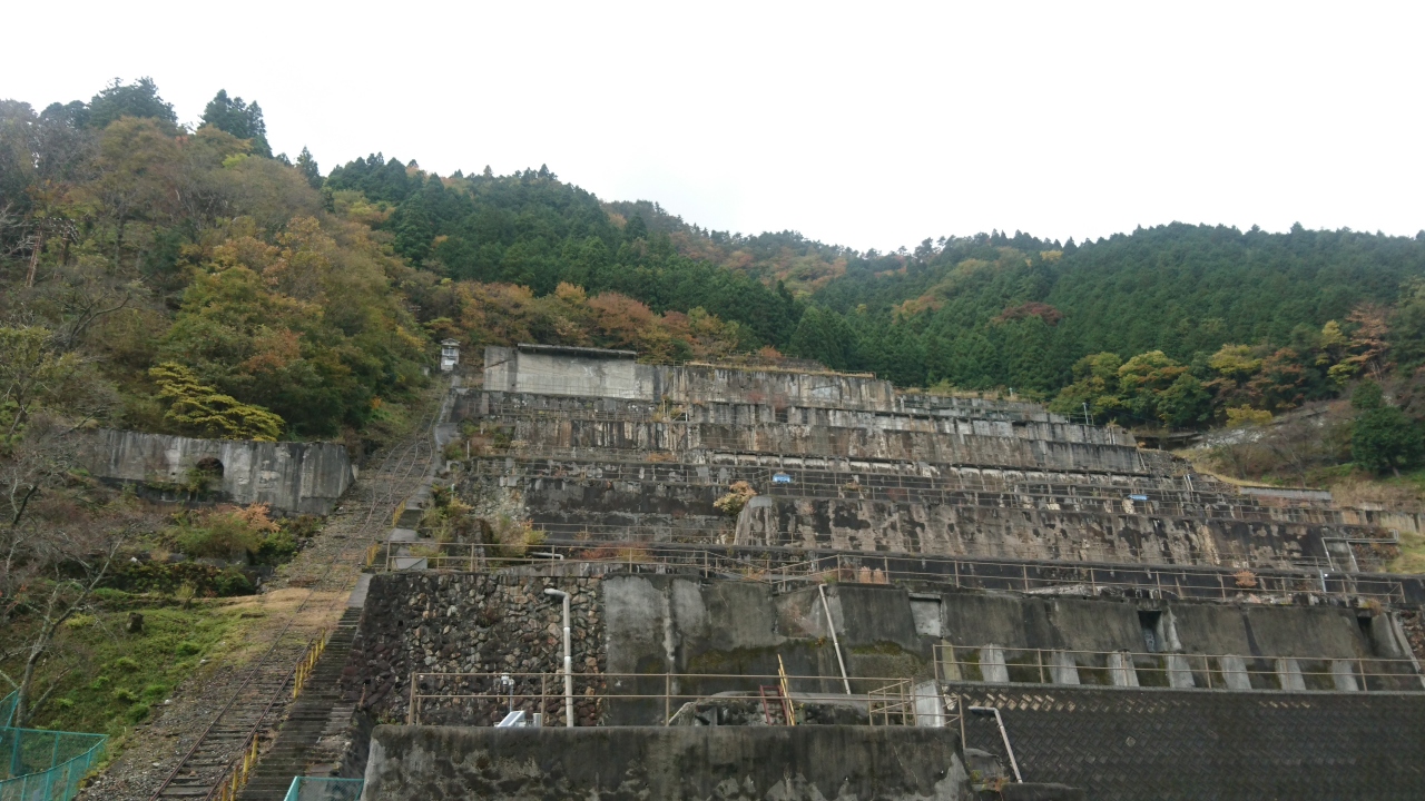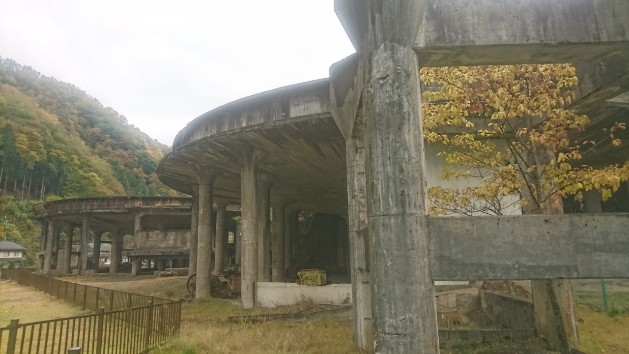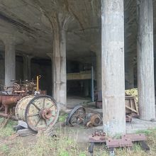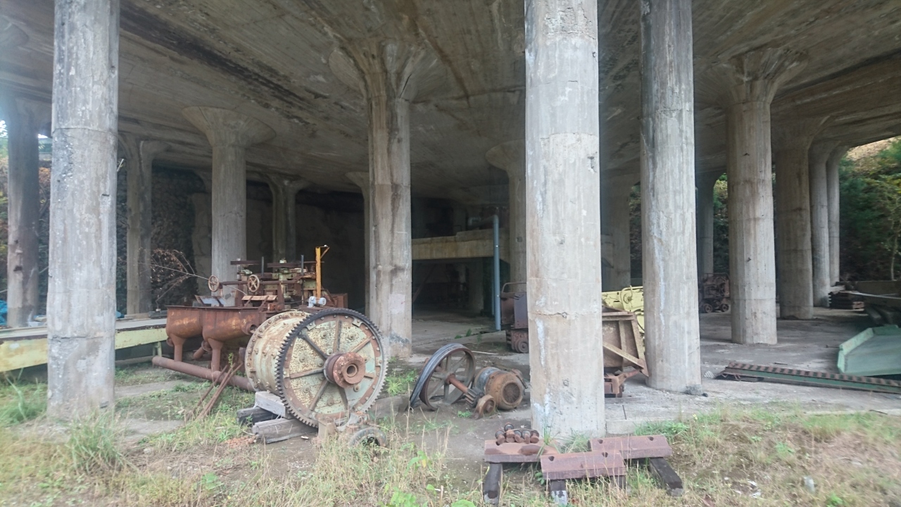 中には入れないし、インクラインも登れないが廃墟感はたまらない。地面に置いてある工具もいい味を出している。