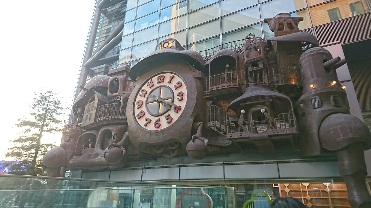 汐留駅を降りてすぐの場所にある日テレの本社で、宮崎駿監督のジブリの雰囲気の大時計があり観光客が写真を撮っていました。夕方だったのでそらジローが中継をしていました。お土産もの屋さんには日テレのグッズのお土産も売っているのでそちらも寄ると楽しめます。