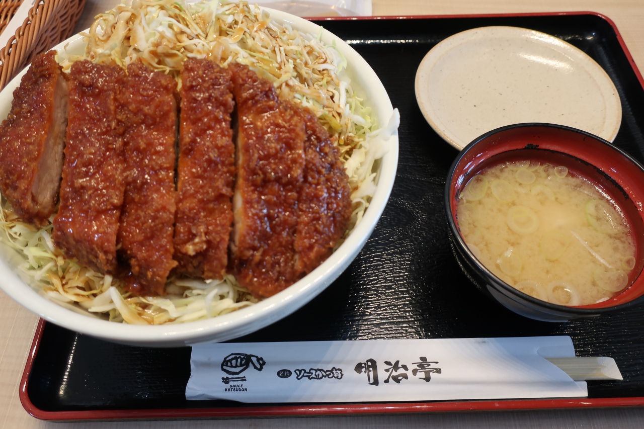 駒ヶ根の元祖ソースかつ丼の店明治亭の支店が軽井沢プリンスショッピングプラザの味の街に出店しています。信州蕎麦以外の長野名物を食べたいと思い入店。平日の11時の開店とすぐに入りましたが、続々と他の客も入ってくる人気店。ソースかつ丼はたっぷりのキャベツの千切りの上にカリッと揚がった脂身の少ないかつ。そしてかつ丼特製のソースが適度な甘さで食べ応え満天でした。妻がたべたソースカツカレーはボリュームがありましたが、カレー自体はボンカレーの様だと言ってました。