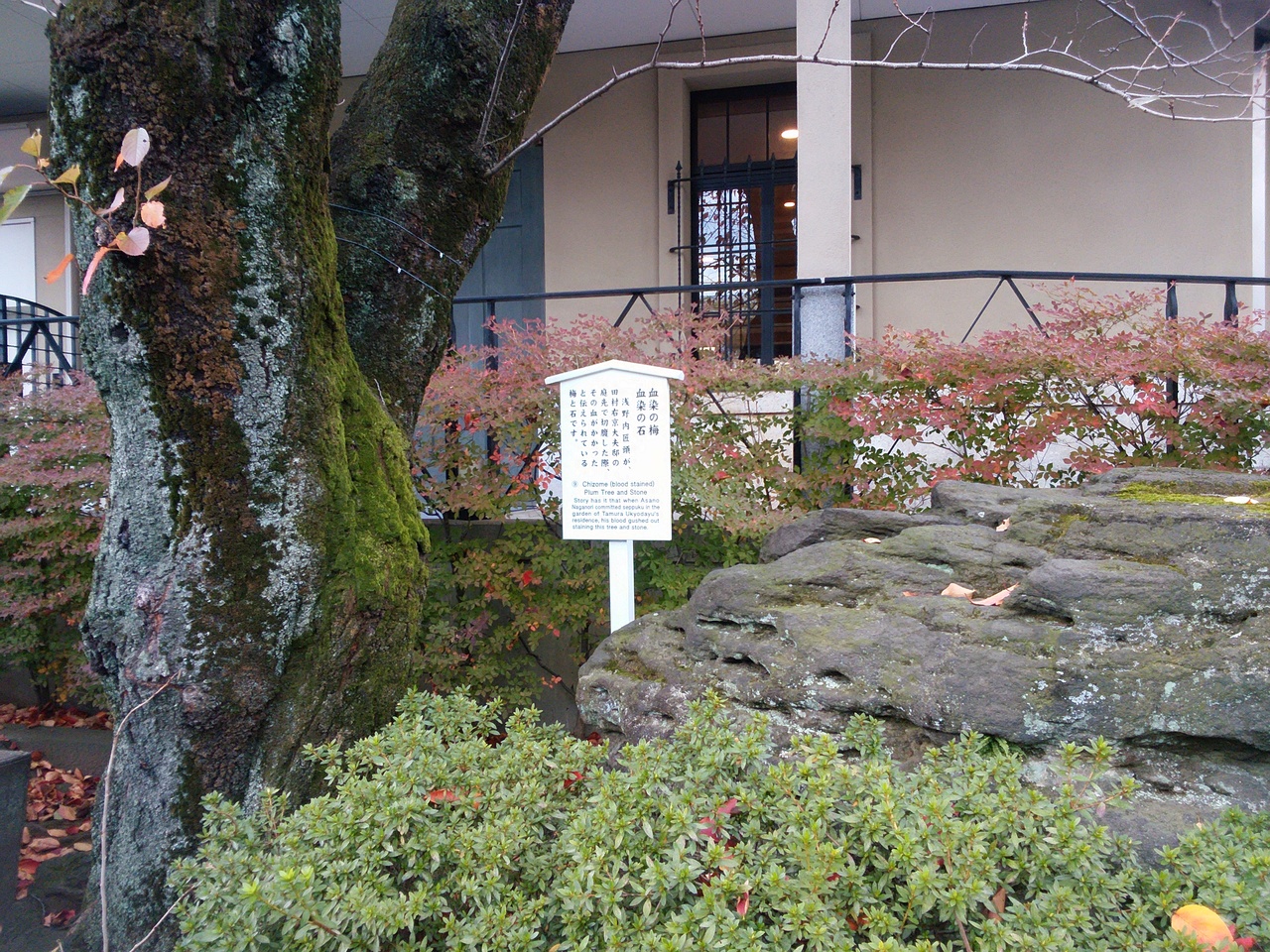泉岳寺本堂から赤穂義士の墓所に向かう途中に血染の梅と血染の石はありました。この梅と石は、浅野内匠頭が田村右京大夫邸の庭先で切腹した際に、その血がかかったと伝えられている梅と石のようです。血の跡などは分かりませんでしたが、史跡のひとつとしては関心が高いものでした。また、すぐ脇には、吉良上野介の首級を洗ったと言われている首洗い井戸もあるのでこれらを見ながら散策すると良いです。