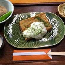 榛名神社にむかう参道にあるお店です。まわりはお蕎麦のお店が多いので、ちょっとひと目をひいています。お豆腐料理、あんみつ、という看板のせいかお客様は女性がほとんどでした。お茶はセルフサービスです。お豆腐とはいえ、ボリュームいっぱいのお食事になりました。