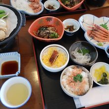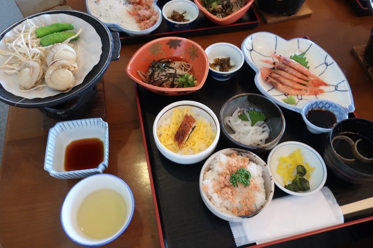 ホタテの陶板焼き、ご飯は鰻のお寿司と