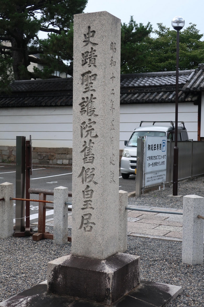 平安神宮の北側、錦林小学校の近くに聖護院旧仮皇居の碑があります。聖護院門跡は天台宗のお寺で、光格天皇、孝明天皇、皇子祐宮(明治天皇)が仮御所として使われたので聖護院旧仮皇居の碑が立てられています。山伏の寺だということは過去に来たことがあり知っていましたが、仮御所として使われたとは思いませんでした。