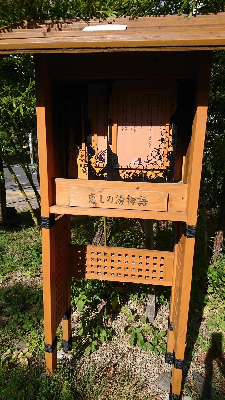 公園では「恋しの湯物語」の伝説を読むことができ、「しあわせの赤い石」も見られます。