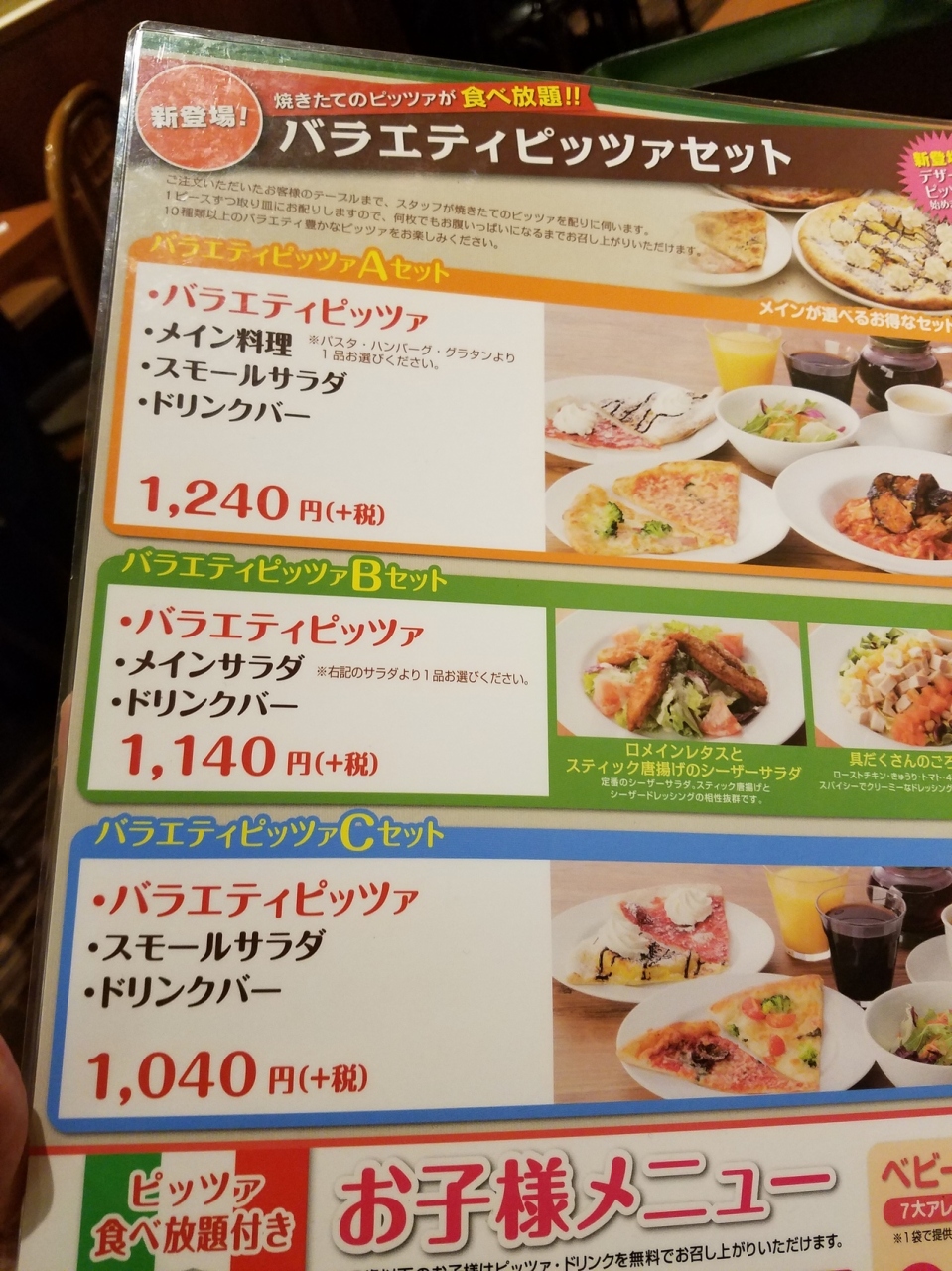 以前はパスタや他のお料理とセットで食べ放題でしたが、久しぶりにいってみると、ミニサラダとドリンクバーとピザ食べ放題のセットが出来ていました。焼きたてのピザを次から次にもってきてくれます。中にはスイーツピザも(*^^*)これで1040円はかなりお得だと思います。