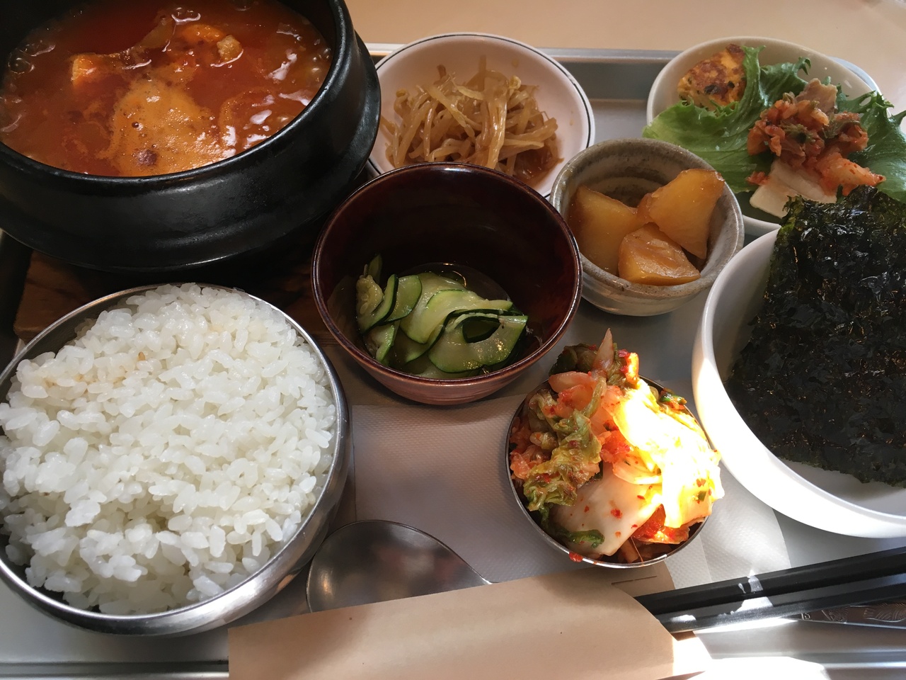 平日ランチタイムは女性客で賑わっていました。注文したキムチチゲ定食は小鍋に盛られたチゲにおかずが6品付いて彩りが良いです。手羽元入りのチゲはキムチにトマトのような甘い酸味を感じる味でご飯が進みました。食後のコーヒーサービス有り。