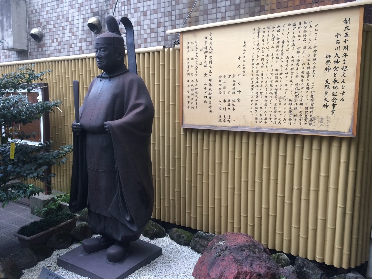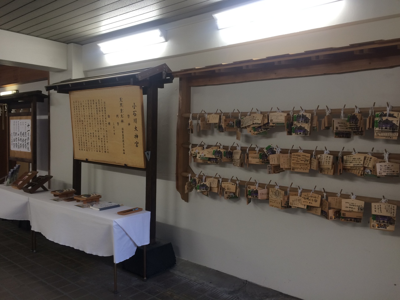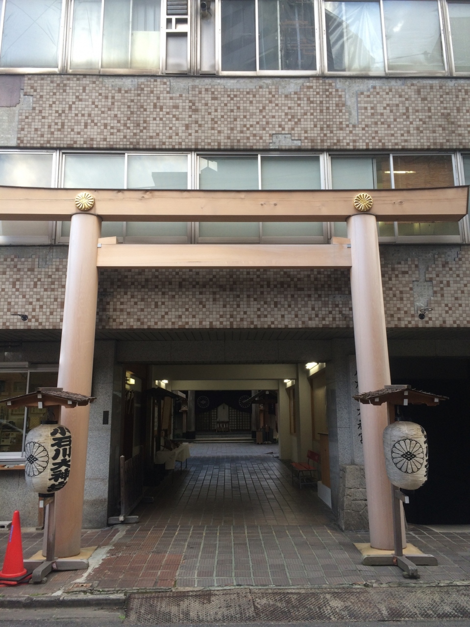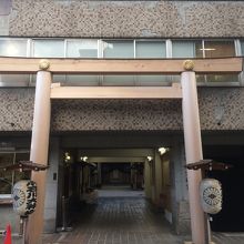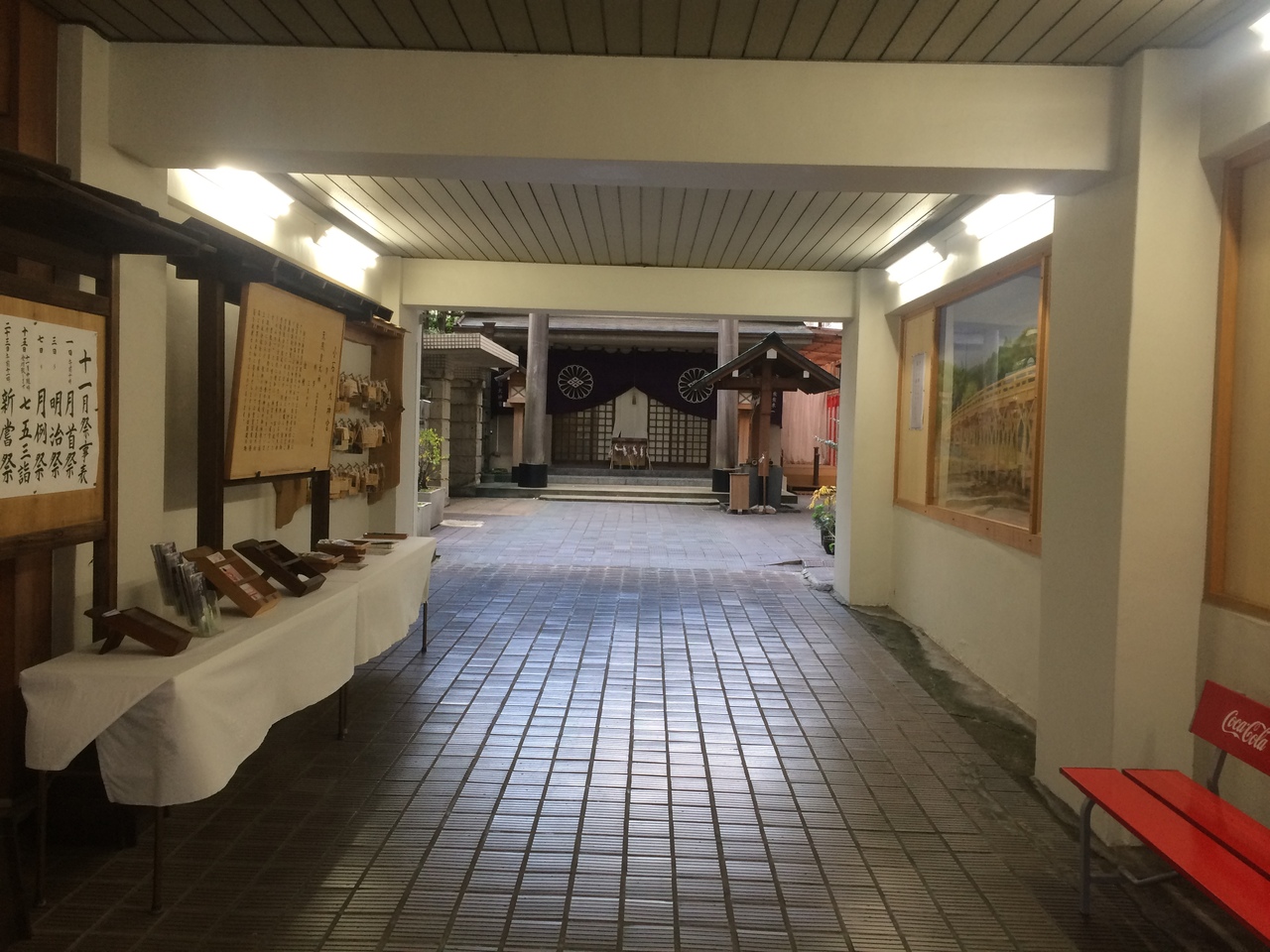 ビルの中を通ると境内で、ビルの横には社務所のでような御朱印受付場所がありました。ビルの中の通路沿いにも展示があり、絵馬が沢山ありました。境内には天照大御神の像があり正面には鳥居と本殿があります。敷地が狭い神宮でした。