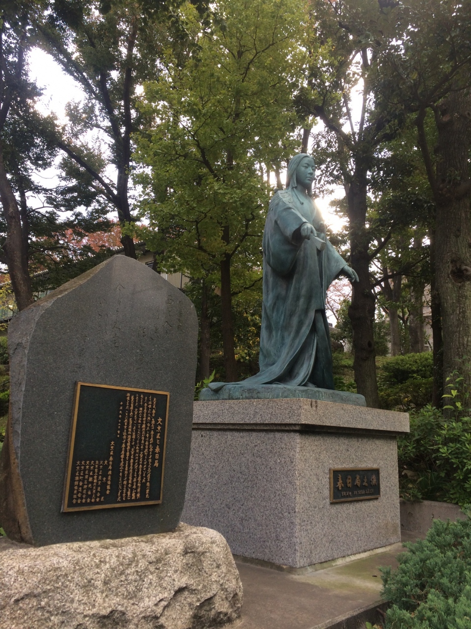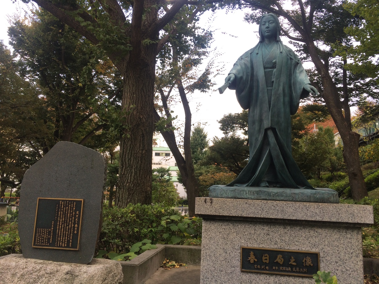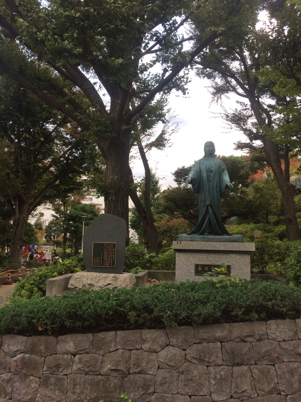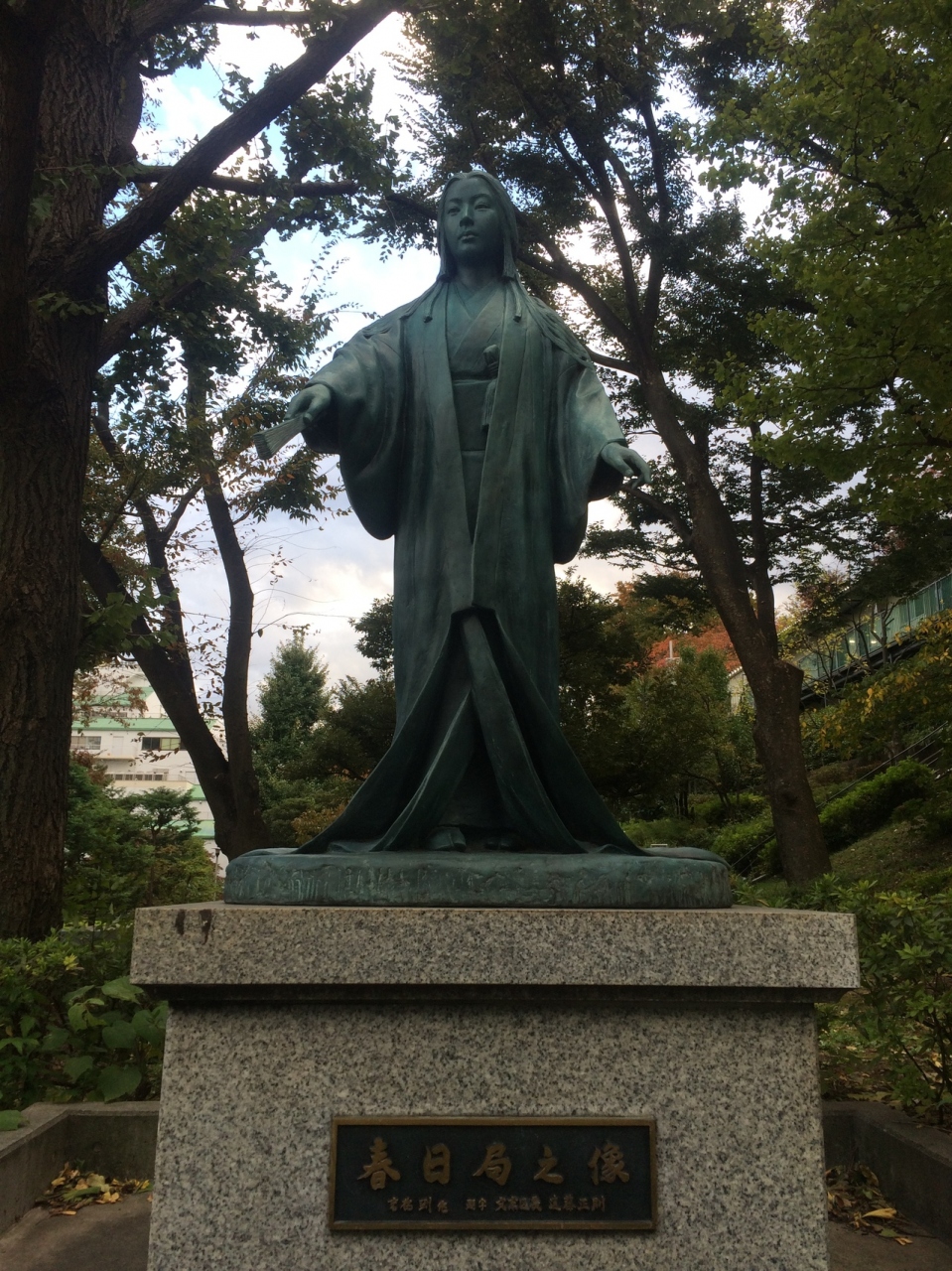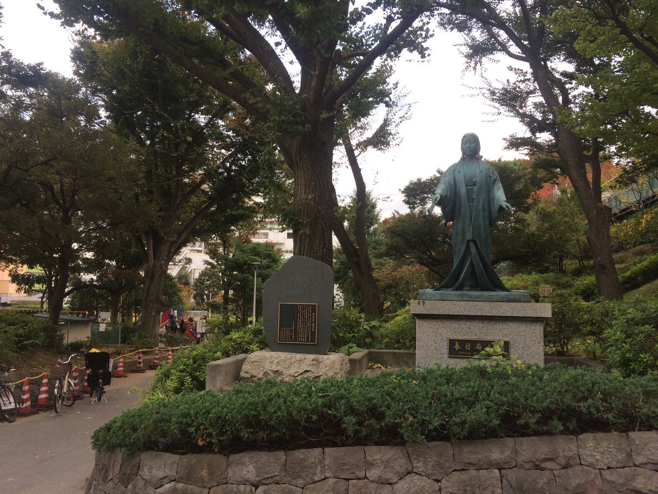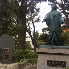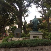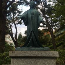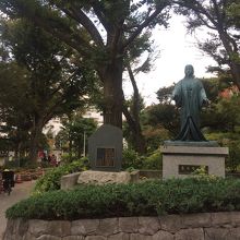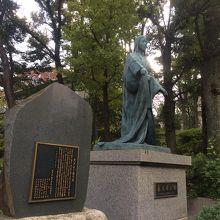 公園入る手前にあり道路沿いにあります。威厳がある顔つきかと思っていましたが、可愛らしい顔つきで若い時の表情でした。説明看板もあり、着物も聞いて、頻繁に掃除したあるのか綺麗な像でした。人通りが多い場所でしたが皆見向きもせず通り過ぎて行きました。