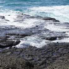 千畳敷岩は、巌門の洞窟とは別の方の道を降りたところ。千畳敷という名前の通り、平たい岩場なんですが、ザブザブと波をかぶっていて、とてもダイナミック。波の静かな日であれば岩場に出れるのかもしれませんが、それでもかなり危険はあるかも。遠くから眺めを楽しむでよしとすべきかなと思います。