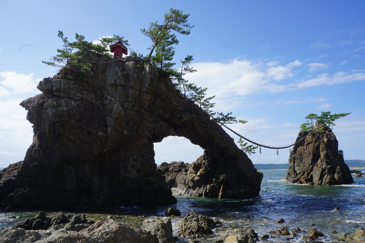 16mと12mの2つの岩が寄り添う形はよくいう夫婦岩の姿。別名が能登二見というのも納得です。国道からさらに海岸に近い旧道に入って行く必要があるのですが、たまたま途中が交通止めとなっていて、ちょっと戸惑いました。岩のすぐに駐車場があって、そこから海岸に降りればすぐそばから眺められます。