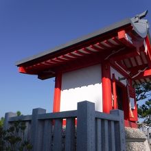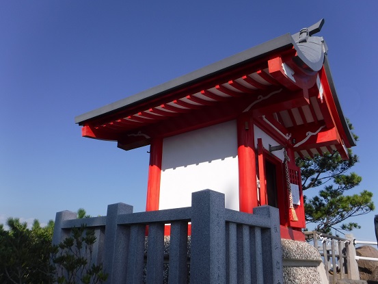 坂本龍馬像を見た後、海岸に下りて海沿いに遊歩道を歩いていくと龍王岬に到達します。階段を上ると青い海と青い空に映える鮮やかな朱塗りの小さなお社があって、それが海洋や漁業の神様として信仰を集める竜王宮です。階段も社のある場所も狭いので、参拝者が多いとすれ違うのも大変です。とは言っても、とても風が強いので長居はできません。