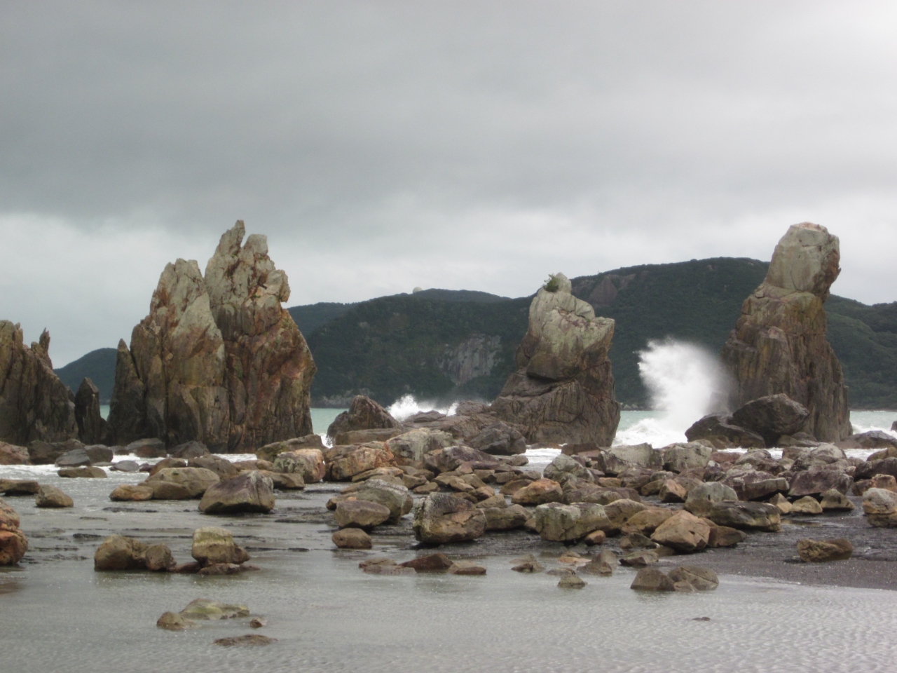 この日は台風接近の影響で、岩に砕ける波しぶきが迫力満点でした!、普段見れない光景に興奮気味?…、ならばそれをバックに記念写真を撮るのがバッチリです!。