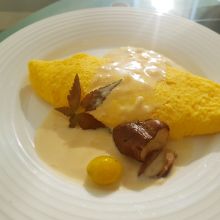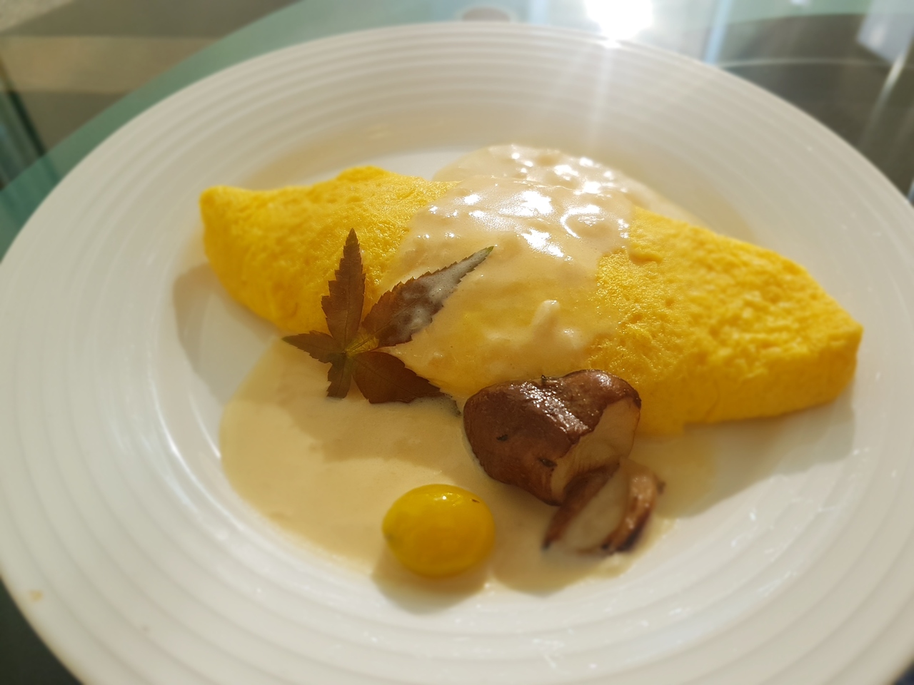 オムレツは上品な仕上がり。クリームソースに銀杏、しいたけ、もみじと秋のプレゼンテーション。