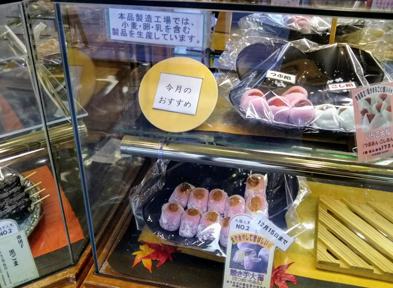 小さな店舗ですが、大福の種類は豊富で、「豆大福」「草大福」「いちご大福」などは つぶあん・こしあん 両方作っているので、好みに合わせて選べます。