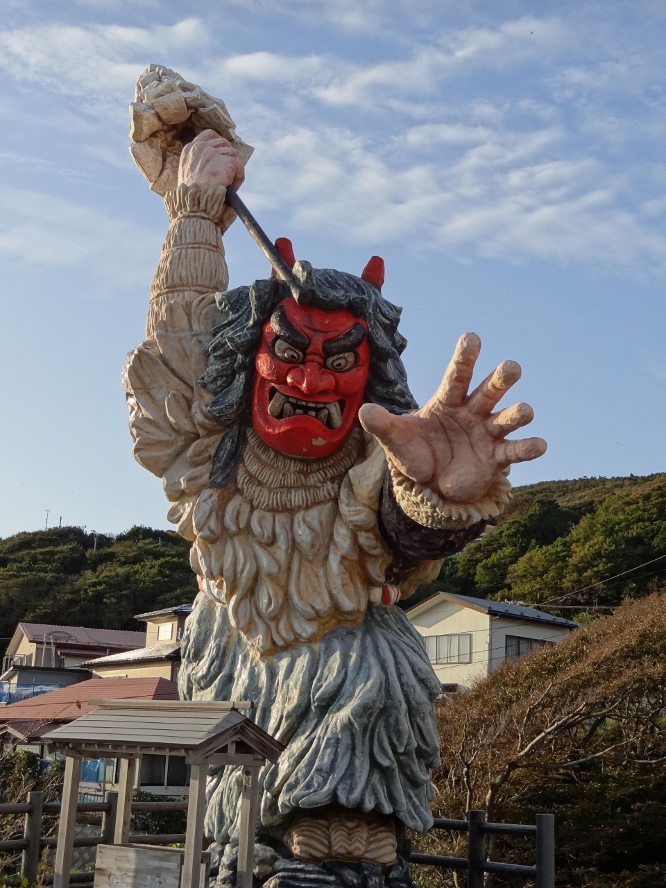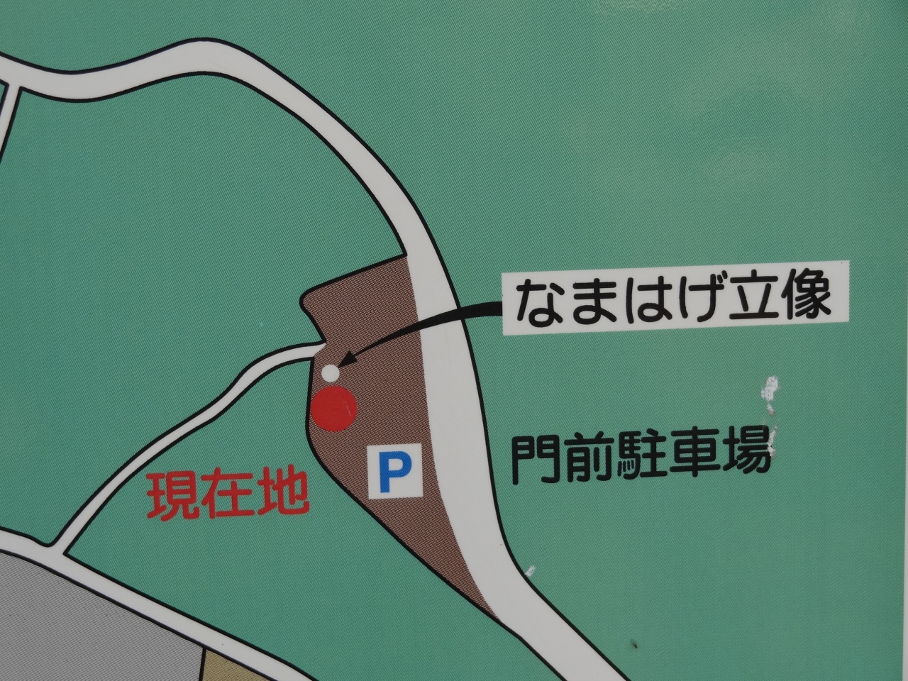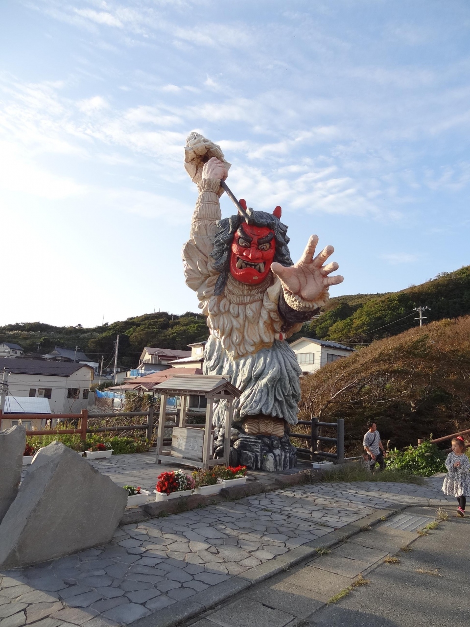 通称「なまはげ案内所」の二体のなまはげ像も迫力がありますが、こちらの赤い顔をしたなまはげ立像は歌舞伎の決まり手を演じていて、左手を大きく広げている姿にビックリ仰天しました。なまはげ立像のすぐ下を小さな女の子が通り過ぎたところで、「悪い子はいねーがー!!」となまはげが叫んでいるかのようでした。
