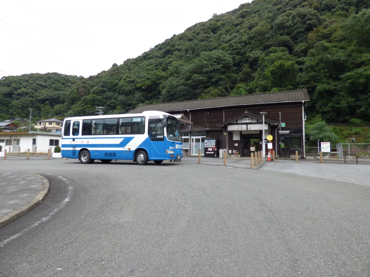 熊本県下に細かいネットワークを持つバス会社です。写真は肥薩線の坂本駅前ですが、発車時刻のかなり前にはスタンバイしていて、地元の方がバスに乗り込んでいました。小型サイズのバスは狭い道をたどって、山間部の集落も結んでいます。
