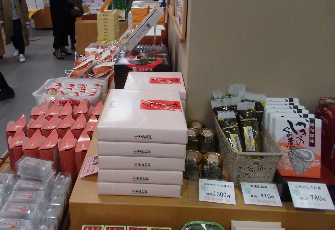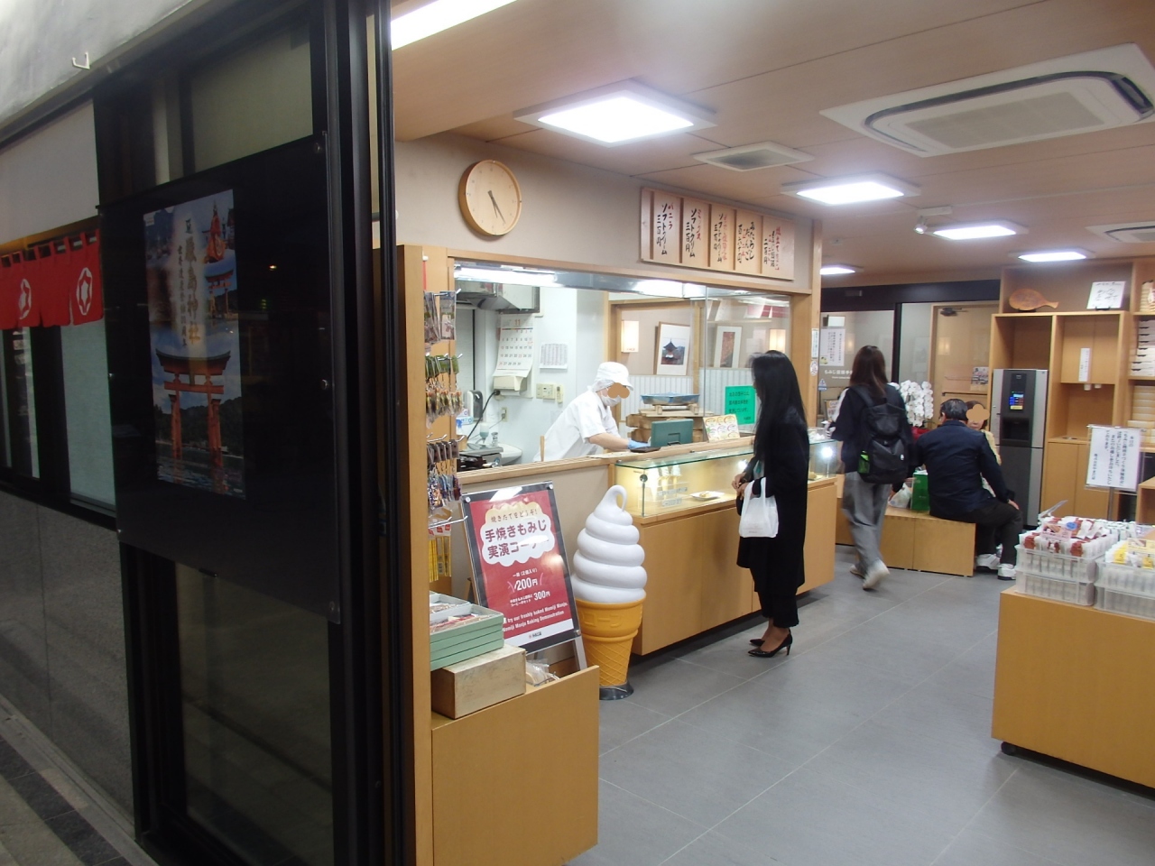 売っているのは、名物のもみじまんじゅうが主のようですが、中身がこしあん、つぶあんだけでなく、クリーム、チョコ、抹茶などいろんな味が、ばら売りや箱売りで売っています。味も好評やようで、修学旅行の生徒さんから年配の方までいろんな客がお土産に買っていました。手焼きのもみじまんじゅうの実演もされていてほかほかを食べることもできるようです。