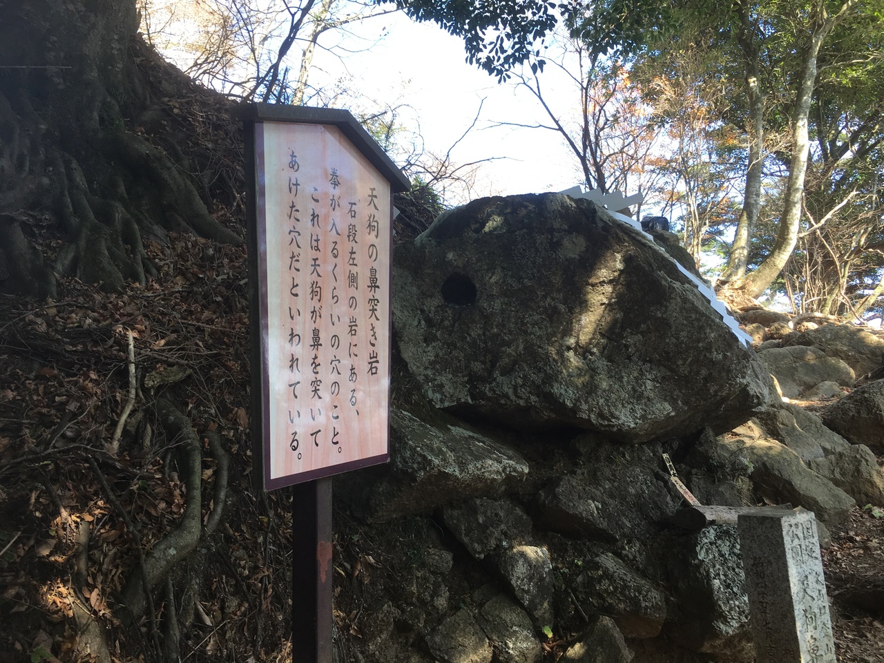 岩の脇にある注意書きを見ると、天狗がこの岩に鼻をついてあけた穴と言われていると書いてました。