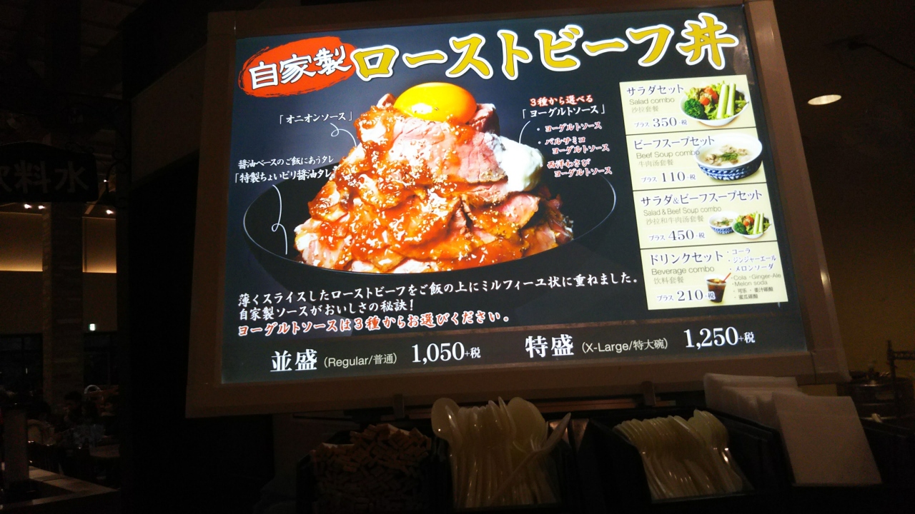 御殿場アウトレットのフードコート内にあります。看板メニューがローストビーフ丼。並盛が1050円+税、特盛が1250円+税 薄切りローストビーフでごはんが隠れます。噛めば噛むほど旨味が出てきて、3種から選べるヨーグルトソースがたまりません。