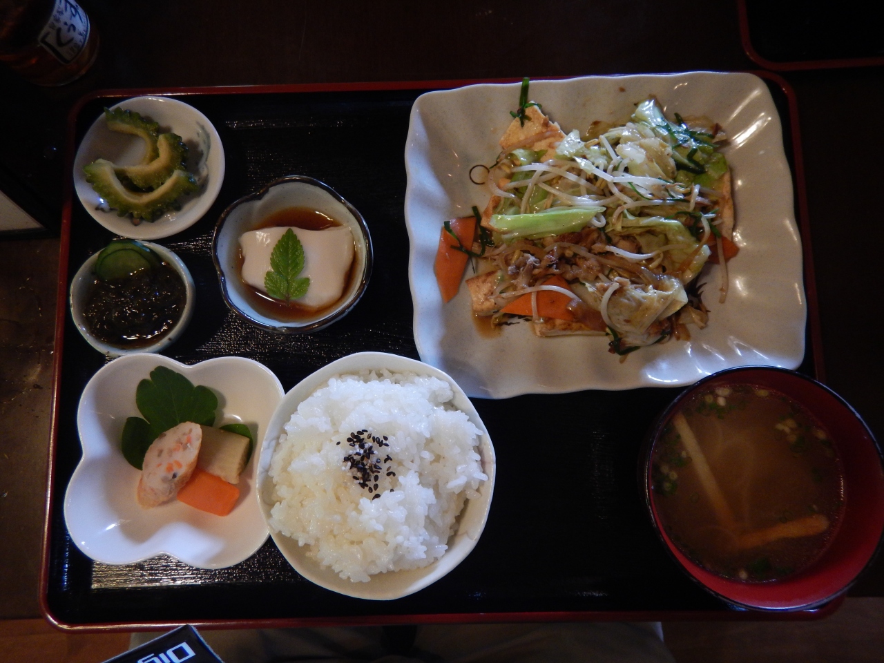 店に入ったのは2時過ぎ。団体客が2組。八重山そばを食べていた。そのためか、私たちが注文する時はそばはあと1人前しかないとのこと。仕方ないのでそばは1人前頼んで3人でシェアする。そば以外の定食をそれぞれ注文した。他に料理を待っている客がいないのにできるまで30分以上かかった。