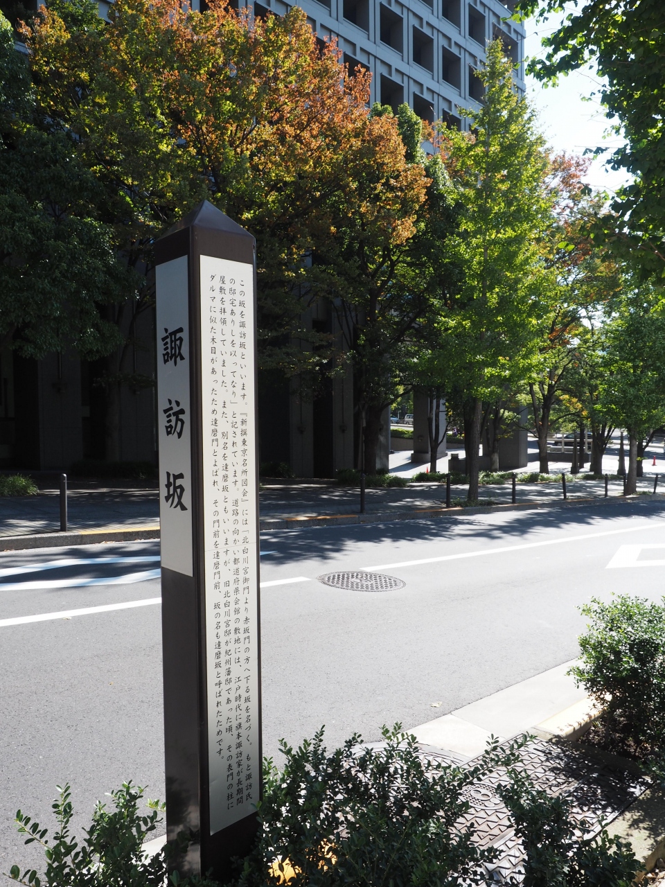 赤坂クラシックハウスの前、つまり東京ガーデンテラスの横を走っている坂道です。坂名の由来は昔このあたりに諏訪という人の屋敷があったからだそうで、東京の地名って案外こういう由来で名付けられたところが多いなと思いました。地方に比べて大名やお金持ちなどのお屋敷が多く、こういった名前がつきやすい環境だったのかななどと思います。