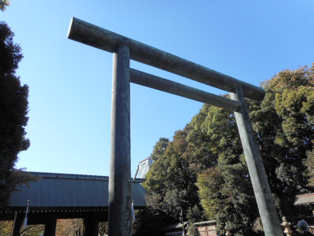 直径1.5メートルもの菊花紋章が扉に取り付けられた神門、そして中門鳥居をくぐり拝殿に向かうと、左手にガラスケースが設えられ、多くの生花の作品が展示されていることに気付きました。生花を英霊(祭神)に奉ることを目的に活動する「靖国神社献華協会」によるものだそうです。神道においては、芸能などを神に奉納し慰め楽しませるという考え方がありますが、目に鮮やかな生花も神を喜ばせる大事な品になるということを感じました。靖国神社では、神楽、能、相撲等の奉納祭事も行われています。