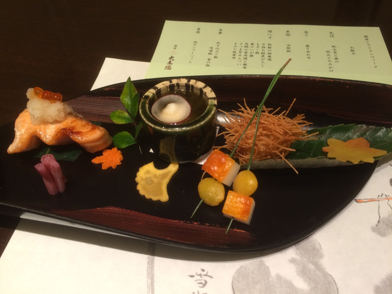 秋鮭の幽庵焼き、子持ち鮎煮びたし、もずく酢、栗のいが揚、イカのウニ焼きと銀杏、さつま芋せんべい、もみじ板雲丹