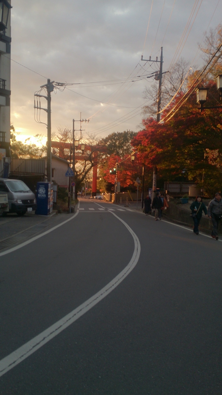 バス旅行で、茨城の港町大洗、ひたちなかから水戸でランチ後、南西の美しい山、筑波山に向かいました。途中、山の麓で富有柿のもぎ取り後、筑波山神社に着きました。美しい紅葉は終盤に差し掛かっています。曇りの一日でしたが、大鳥居に夕日がきれいでした。