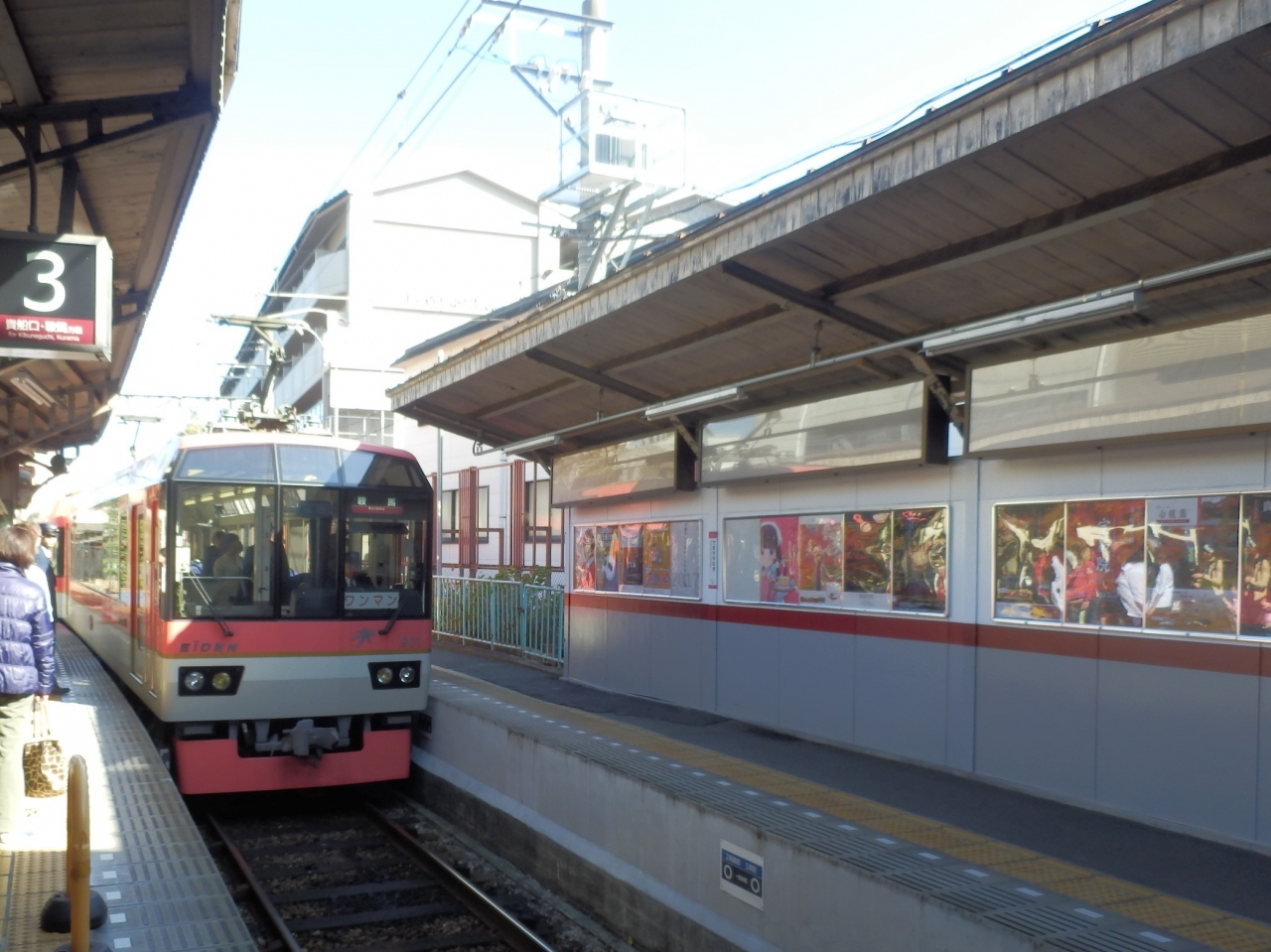 京都市の出町柳駅がターミナルになっている鉄道、駅のホームは外の道路とフラットで平地ホームが三線ある、一番線が比叡山方面行で一両、二番線は途中まで行、三番線が鞍馬行。2と3番からは最大二両編成の電車、一両の長さが超短く専用軌道を走る市電タイプ、大半の駅は無人駅、今日は鞍馬寺へ参拝、数回に一度"きらら"とよぶ観光列車が鞍馬線に運行しているので一本見送ってきららに乗車、座席の半分が窓に向かって配置されいたので車窓からの景色を楽しめました、途中、市原駅と二ノ瀬駅間に楓が線路両側に植えられていて"もみじのトンネル"と呼ばれている、今日(11月13日)は鞍馬付近はもみじの見ごろであったので紅葉したもみじの中を潜っての列車の旅は旅情をさらに深めることができました。