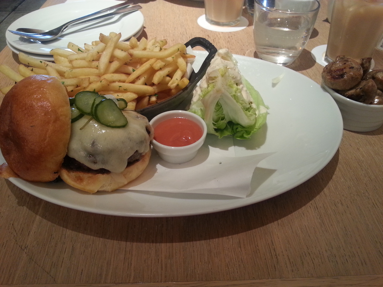 いつもはパンケーキとスクランブルエッグを注文するのですが。今回はランチという事もあって初めてハンバーガーを注文!!こちらもおいしかったです!!旦那さんはスクランブルエッグを注文したのでマッシュルームを追加!この、マッシュルーム大好きです♪