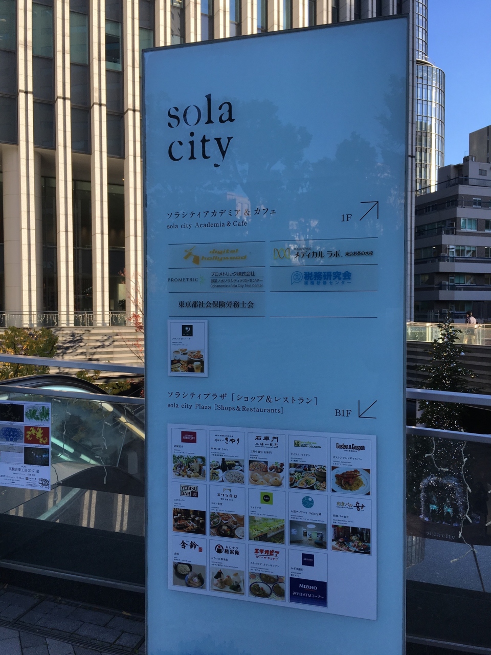JR御茶ノ水駅聖橋口を出ると、左前方に高層ビルの「ソラシティ」が見えました。上層階はオフィスなどで、多目的に利用出来る会場などもあるようです。一階から地下一階へのエスカレーターがあったので降りてみると、レストラン街で和洋中いろいろなレストランがありました。テラス席もあり、お店で買ったものを食べることもできました。スーパーやコンビニもありました。