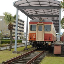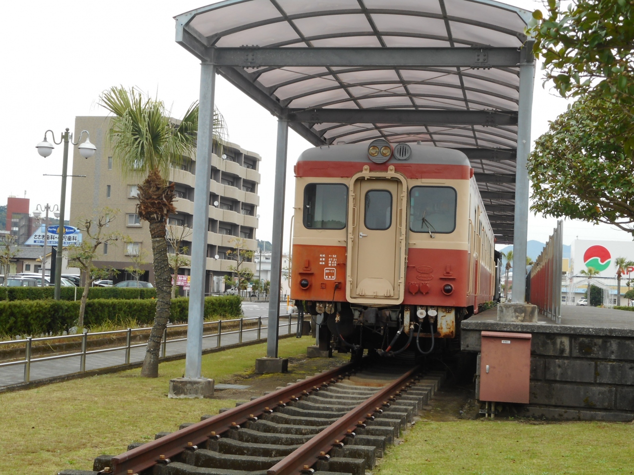 廃止された駅構内線路跡に作られた公園で、懐かしい国鉄時代のディーゼルカーがみられる。駅は,今は東側に移転し、以前の規模の駅の面影はない。