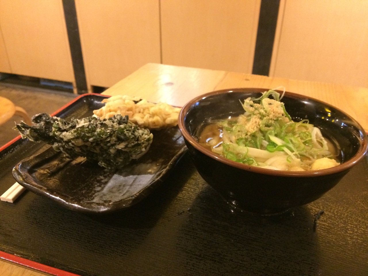 金刀比羅神社の参拝を終えると隣のブロックに讃岐うどんの看板が見えました。気分がちょっとうどん県化したところにこれが見えるとは、経営者は好立地に出店していますね。日曜日の11時過ぎという時間であったため、店内には先客は1名のみでがらんとしていました。麺の量は小、中、大の3つ、うどんに乗っけるてんぷらはすべて100円と嬉し泣きさせるような価格設定。うどんは小を選択しましたが、てんぷらは「ごぼう」と初めて見る「わかめ」、わかめのてんぷらはサクサクして美味しかったですので、再度選択することもあるかな。うどんのコシはそんなに強くありませんでしたが、こんなもんで十分かと思います。
