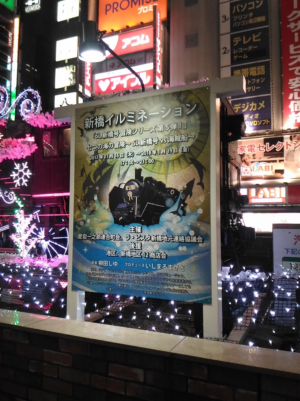 JR新橋駅目の前ののSL広場です。本日は新橋にて飲み会ですが、いつの間にかJS機関車がイルミネーションで飾られているではありませんか。うー、もうクリスマスなんですね。11月16日から来年の1月19日までやっていますので是非。