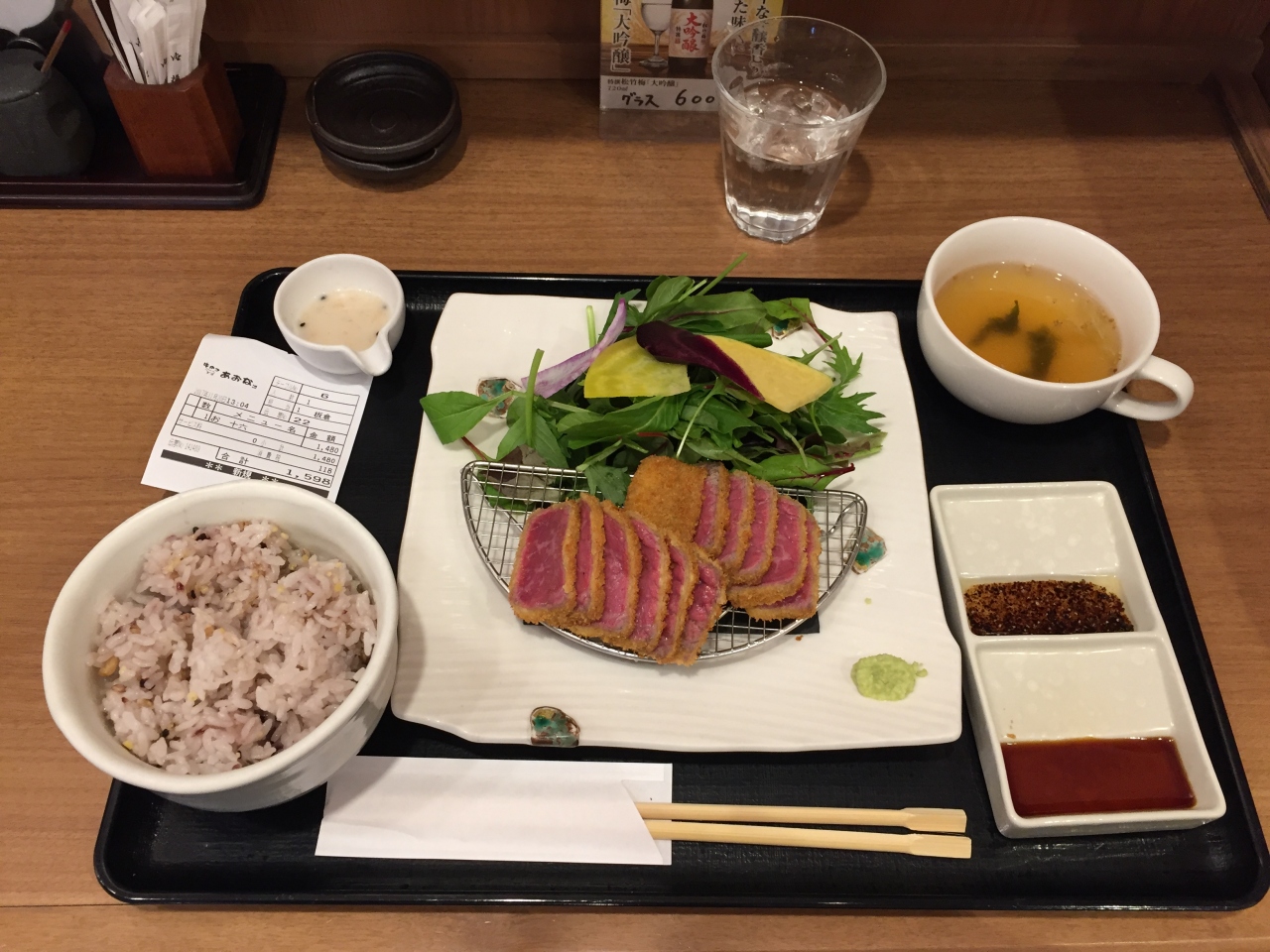 アメ横に行った際に昼食に寄りました。黒毛和牛の牛かつを注文しました。牛かつがかなり薄く切られていましたが、一口で食べられ美味しかった。又、牛かつにつける何種類かのタレが絶妙でした。十六穀米とサラダも美味しく頂きました。