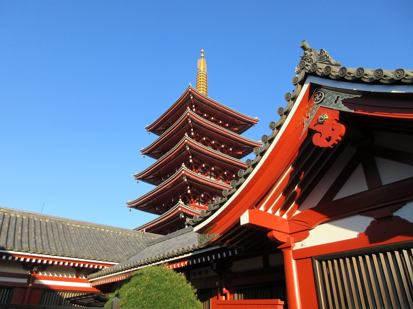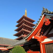 浅草寺の敷地内西側にある五重塔で、朱色に塗られた美しいフォルムは写真映えします。戦後に復元された五重塔なのですが、バランスの良さという意味では日野市の高幡不動尊と並んで美しいと思います。宝蔵門に向かって右手から写真を撮ると宝蔵門と五重塔が一枚に収まって記念の一枚が写せます。