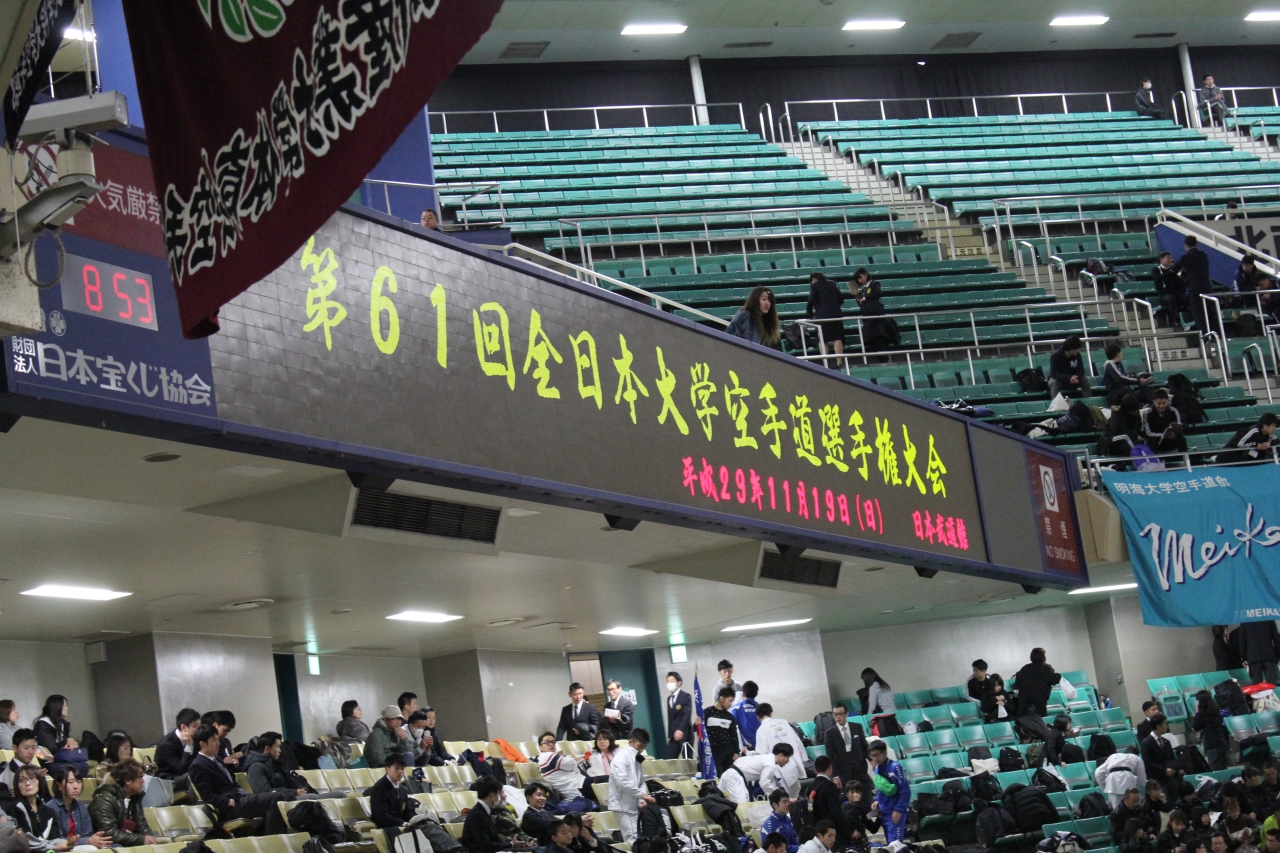 11月19日、日本武道館にて全日本大学空手選手権大会がおこなわれました。かみさんと2人で見に行きました。昨年は記念大会で土曜・日曜の二日に分かれての大会でしたが今回は、日曜一日での大会です。一回戦は結構しょぼかったです。