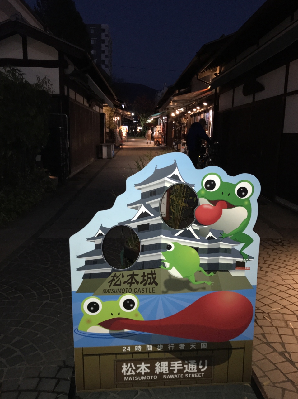 松本市街の中心を流れる田川沿いに昔からあるのがなわて通りです。松本へ行くと懐かしさからつい立ち寄りたくなるのですが、いつからかカエルが名物になっているようです。おすすめは地元野菜や果物とフランスパンが美味しいスイト。そして、縄手横丁にある焼き肉の老舗名月館です。女鳥羽川にかかる橋から眺める松本の夜景も情緒があり綺麗です。