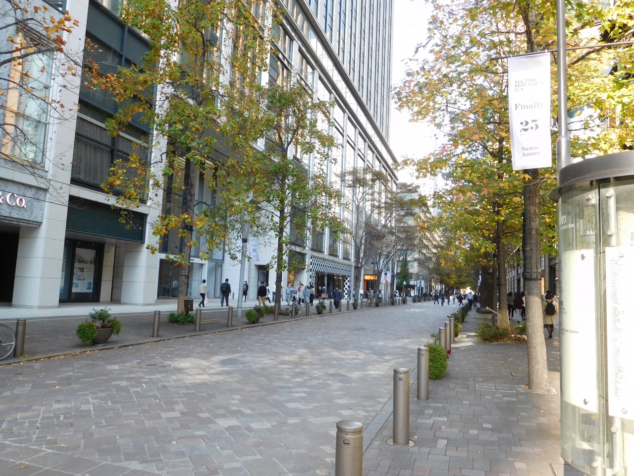 丸の内エリアのオフィスビルの間にある通りです。綺麗に整備された道で、両脇には背の高い街路樹が植えてあり、冬の夜はイルミネーションスポットにもなります。今回訪れたのは昼間だったので、紅葉している街並みを散策する事が出来ました。また、個性的なアート作品のオブジェもあるので、いろいろと探してみると面白かったです。