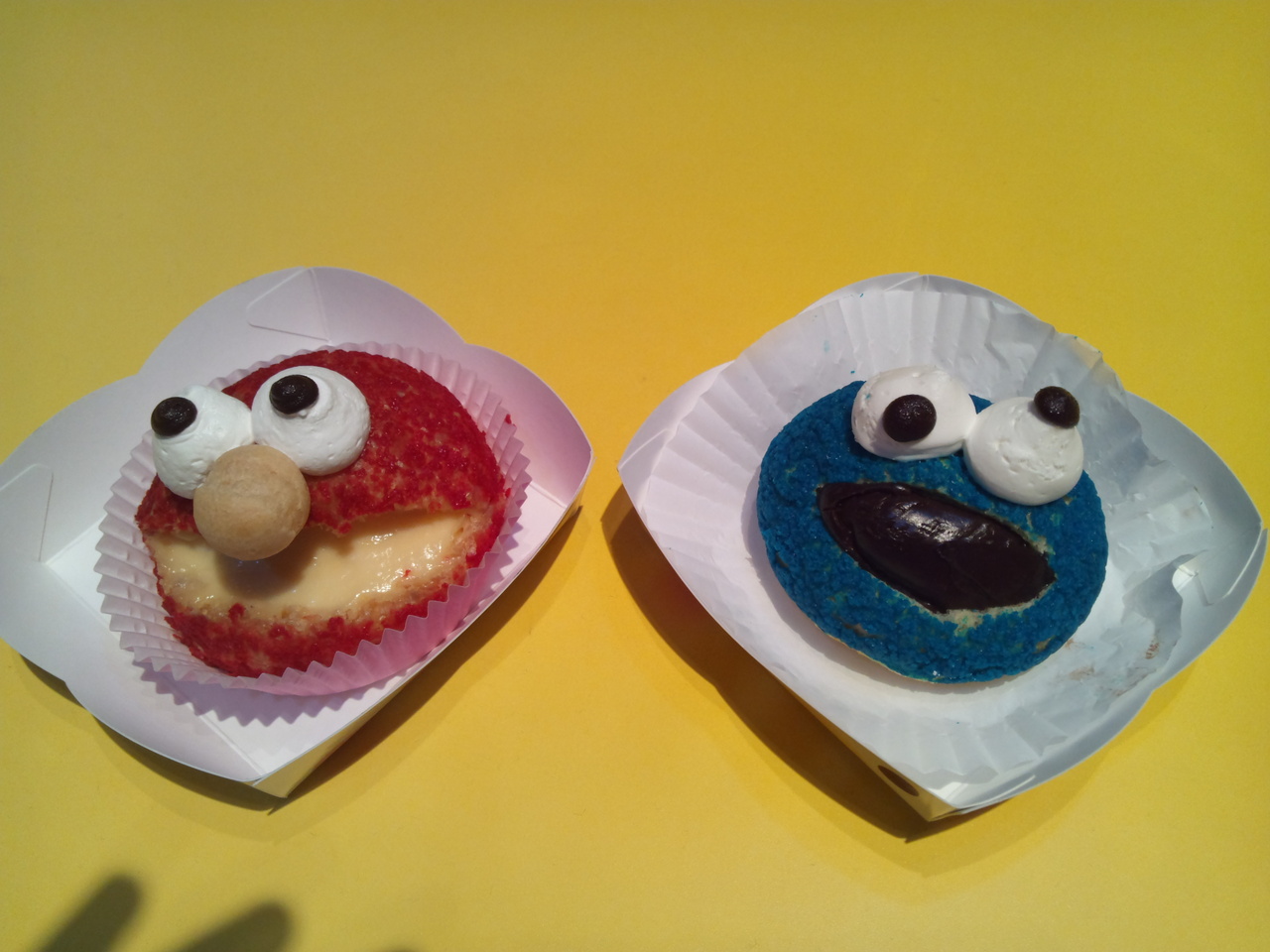 青いクッキーモンスターと赤いエルモがかわいい!思ったより小ぶりなシュークリームです。