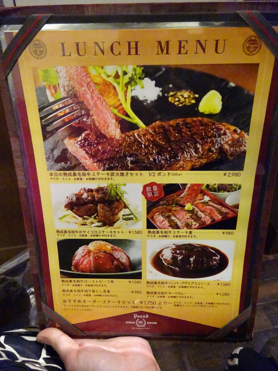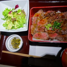 シックな店内とゴージャスなランチ、ステーキ重以外にもローストビーフ丼、サイコロステーキ、切り落とし肉など迷います。
