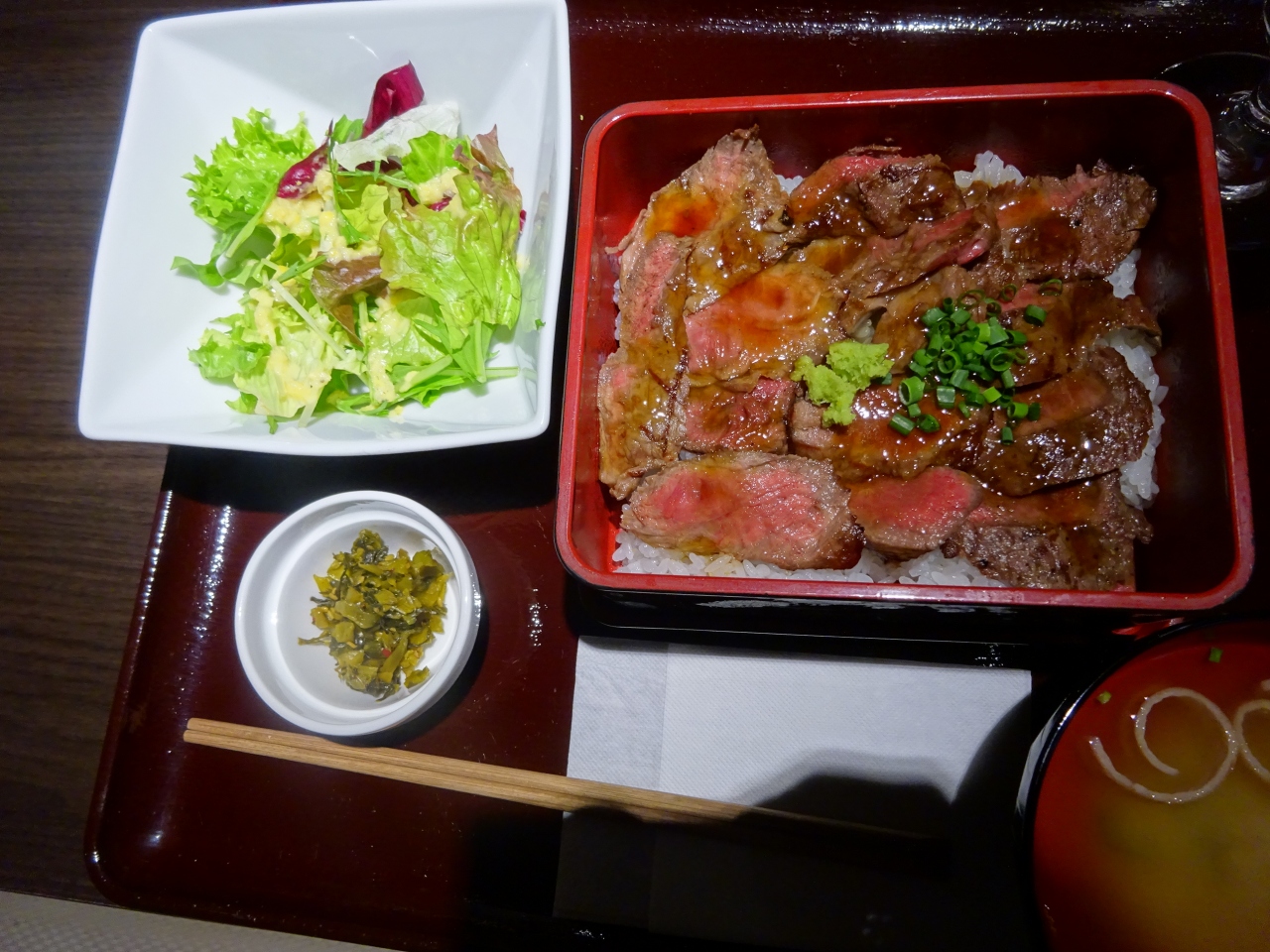 特に熟成肉の切り落としステーキ重は、1日限定10食ですが980円と破格値でとっても美味しいです。