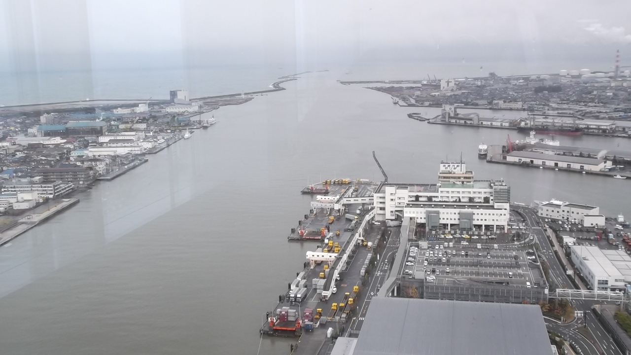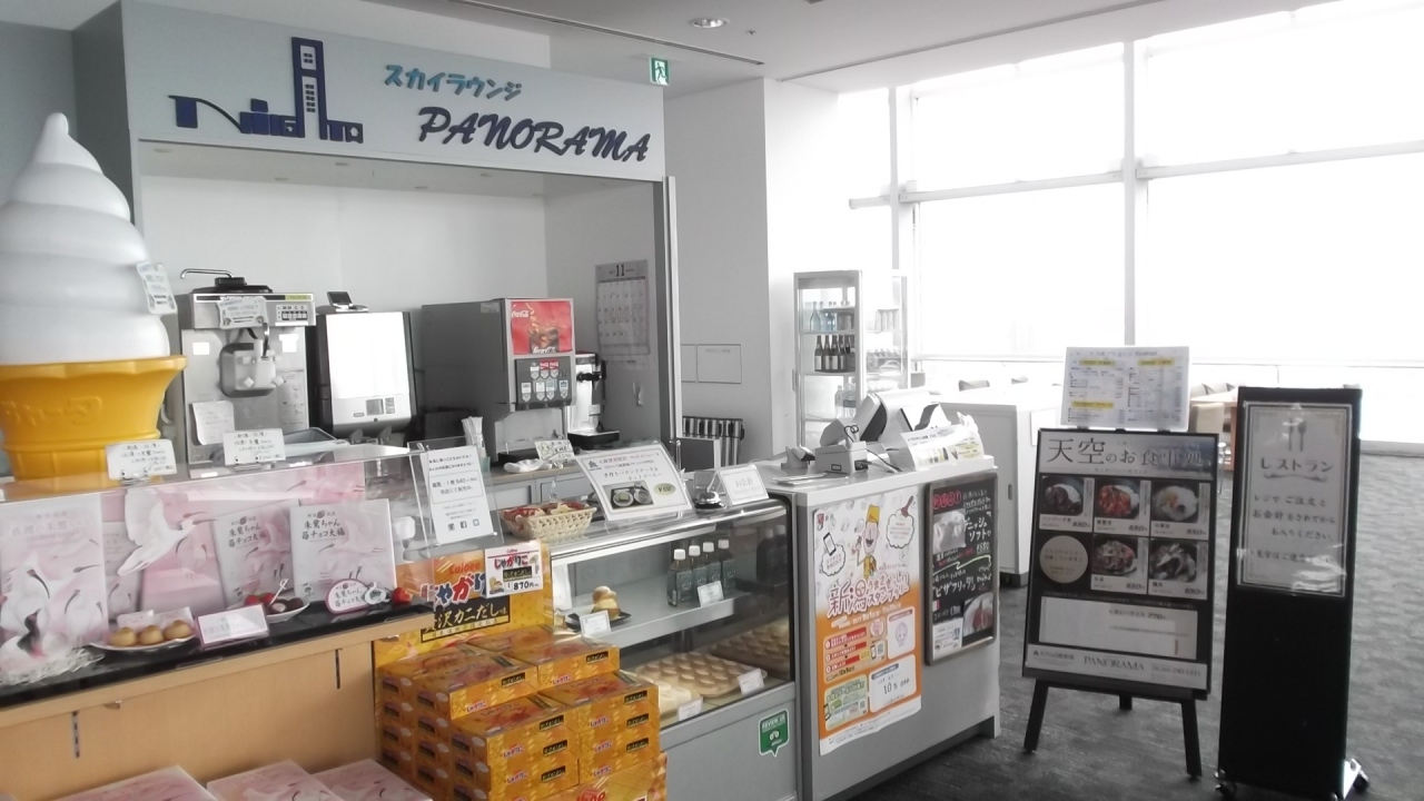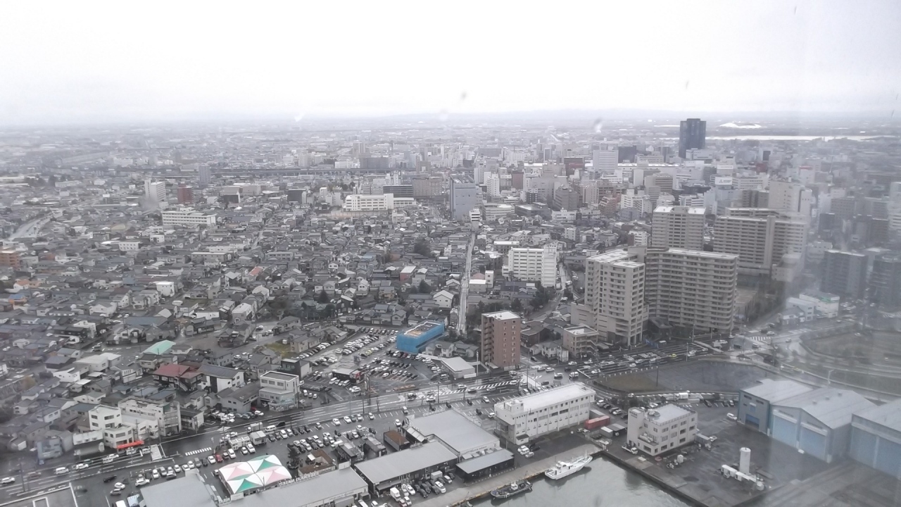 32Fへ。ほんとに360度パノラマの眺望で、見渡す限り日本海、佐渡島、五頭連峰や市街地の景観が一望できました。中には売店やレストランの設備も完備されている。