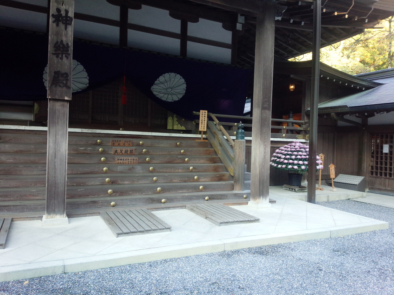 伊勢神宮内宮の神楽殿ですが、ここに神様がいらっしゃっててお参りをするというよりはここでお守りやご祈祷や御朱印を申し込んだりする場所です。でもとても立派な建物でやはり伊勢神宮に来たら手にしたいお守りも色々な種類がありました。お参りの最後によってください。紅葉の季節は菊も綺麗でした。