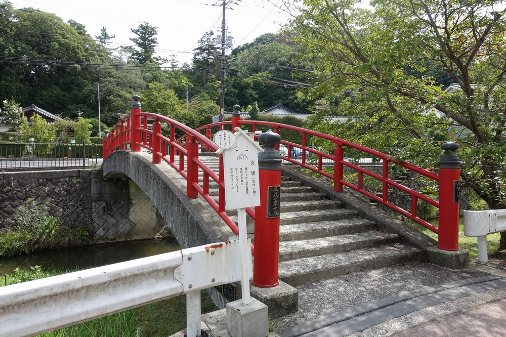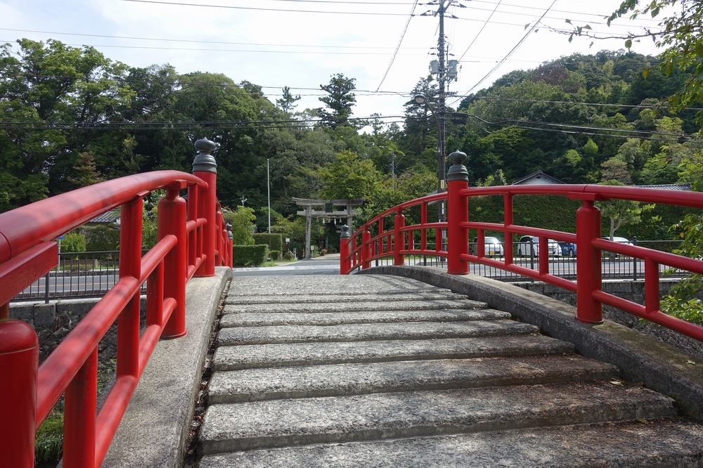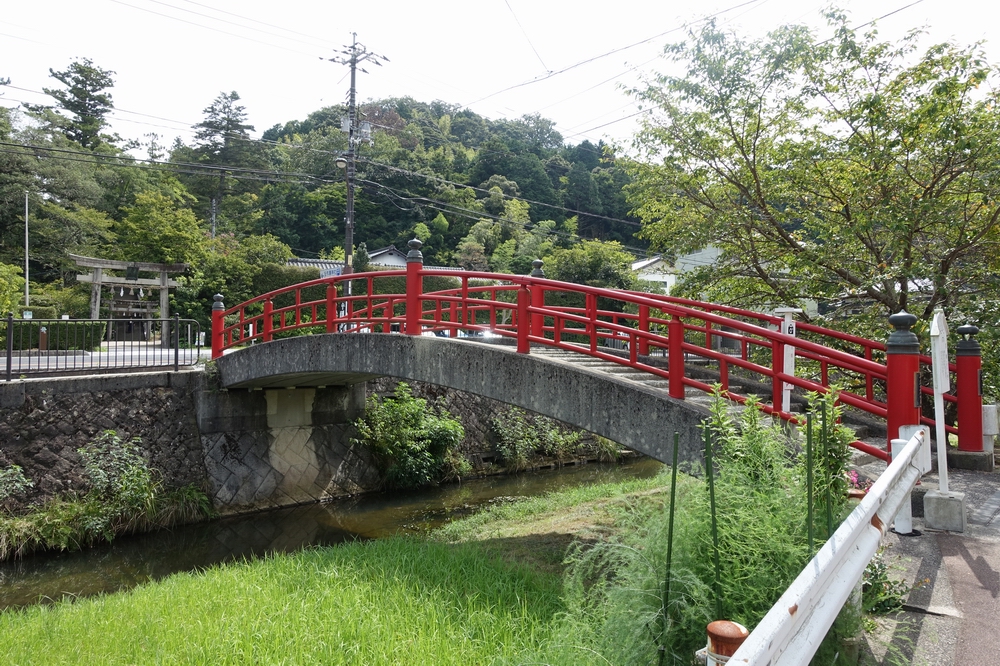 玉作湯神社前の玉湯川に架かる赤い橋です。橋は平坦ではなく階段状に中央が盛り上がった構造になっていました。竣工年月が平成7年10月となっていたので、特別歴史的な価値のある橋ではないようですが、赤くて目立つので記念写真向き。